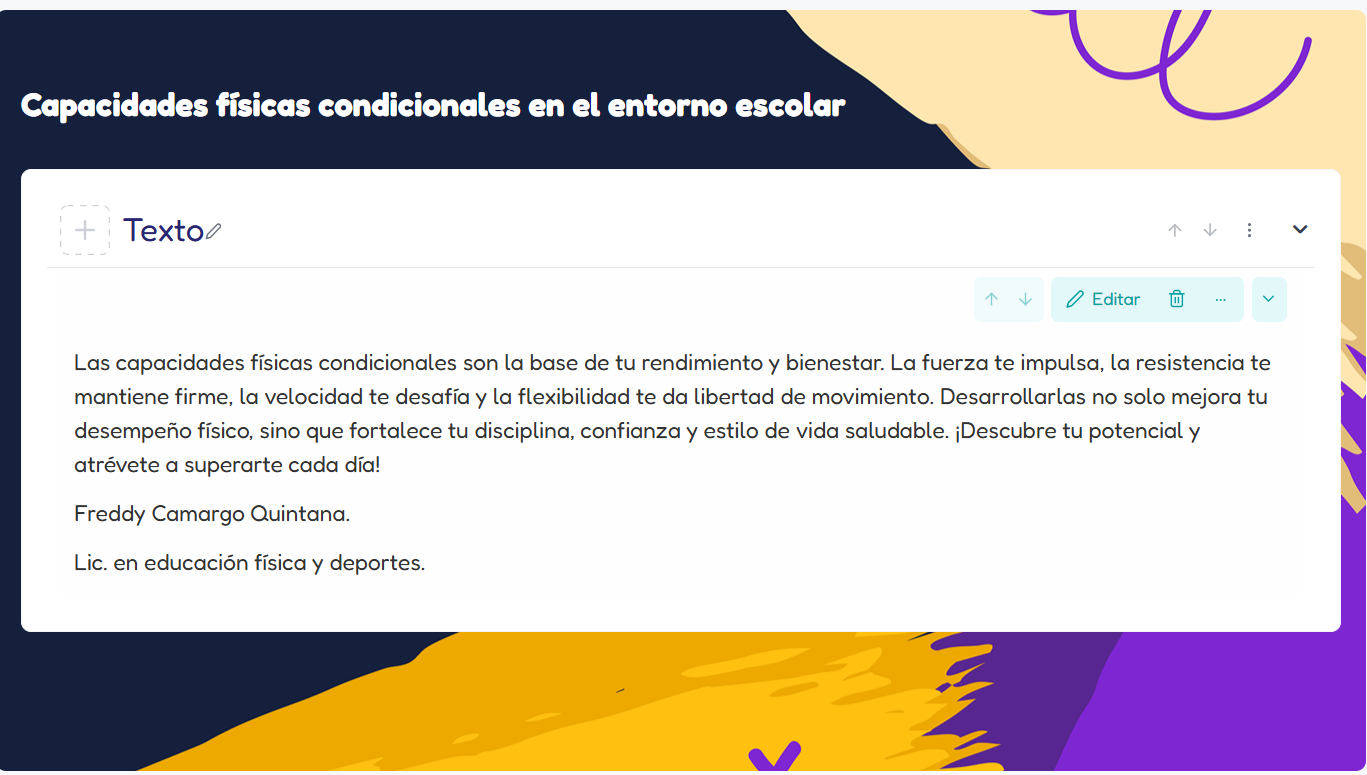 Este Recurso Educativo Digital aborda el desarrollo de las capacidades físicas condicionales en el entorno escolar, permitiendo a los estudiantes comprender y fortalecer habilidades como la fuerza, resistencia, velocidad y flexibilidad. A través de contenidos explicativos, recursos visuales y actividades interactivas, el material busca favorecer el aprendizaje significativo y la práctica de la actividad física en el área de educación física.