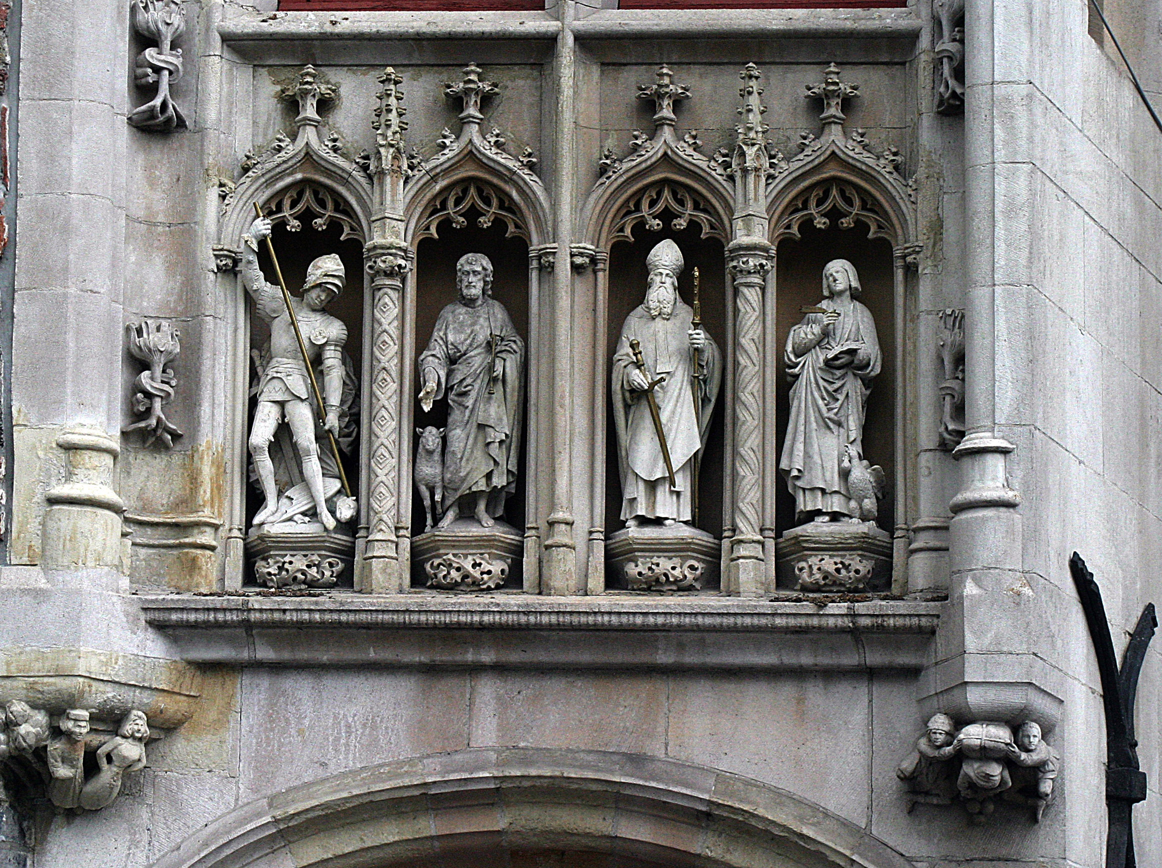 Estatuillas encima de la puerta de la Provinciehuis, Brujas, Bélgica