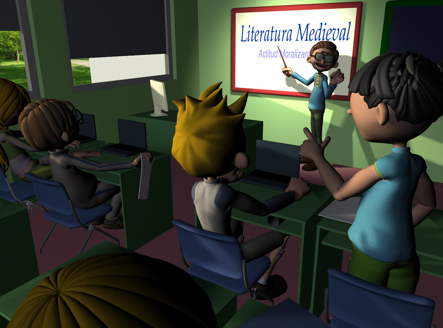 Imagen de un profesor en el aula mientras explica la literatura medieval a un grupo de alumnos. Al fondo, una presentación que le sirve de ayuda.Esta imagen fue elaborada por Fco. Javier Pulido para los itinerarios curriculares del CeDeC.