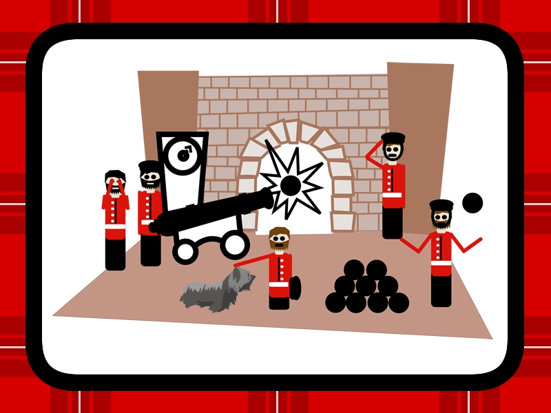 Cuento Greyfriars Bobby: Bobby en el castillo de Edimburgo mientras los soldados dan el cañonazo a la una en punto