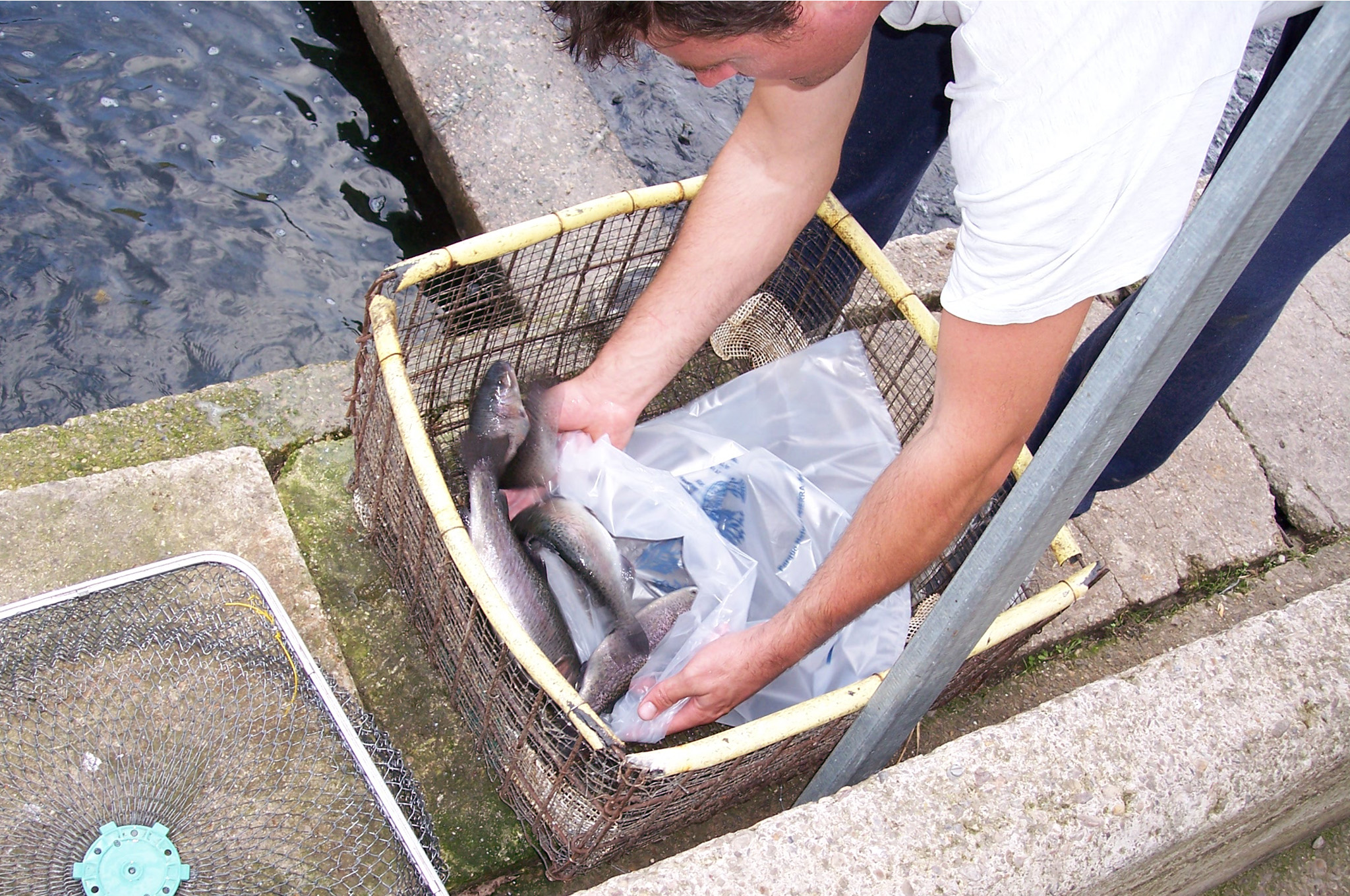 Hombre preparando una trucha para su venta