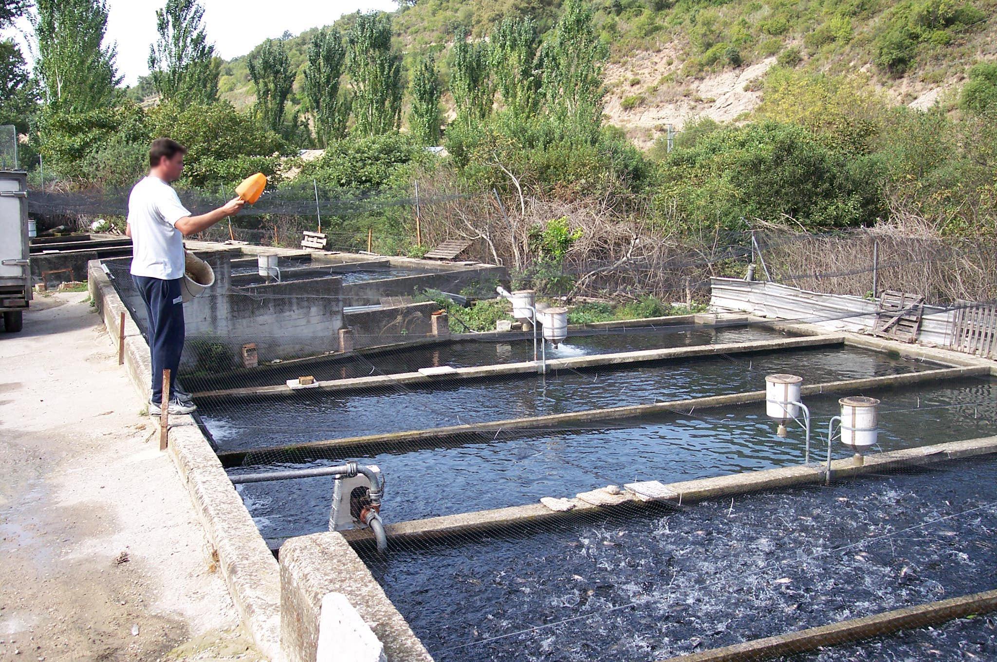 Hombre alimentando truchas