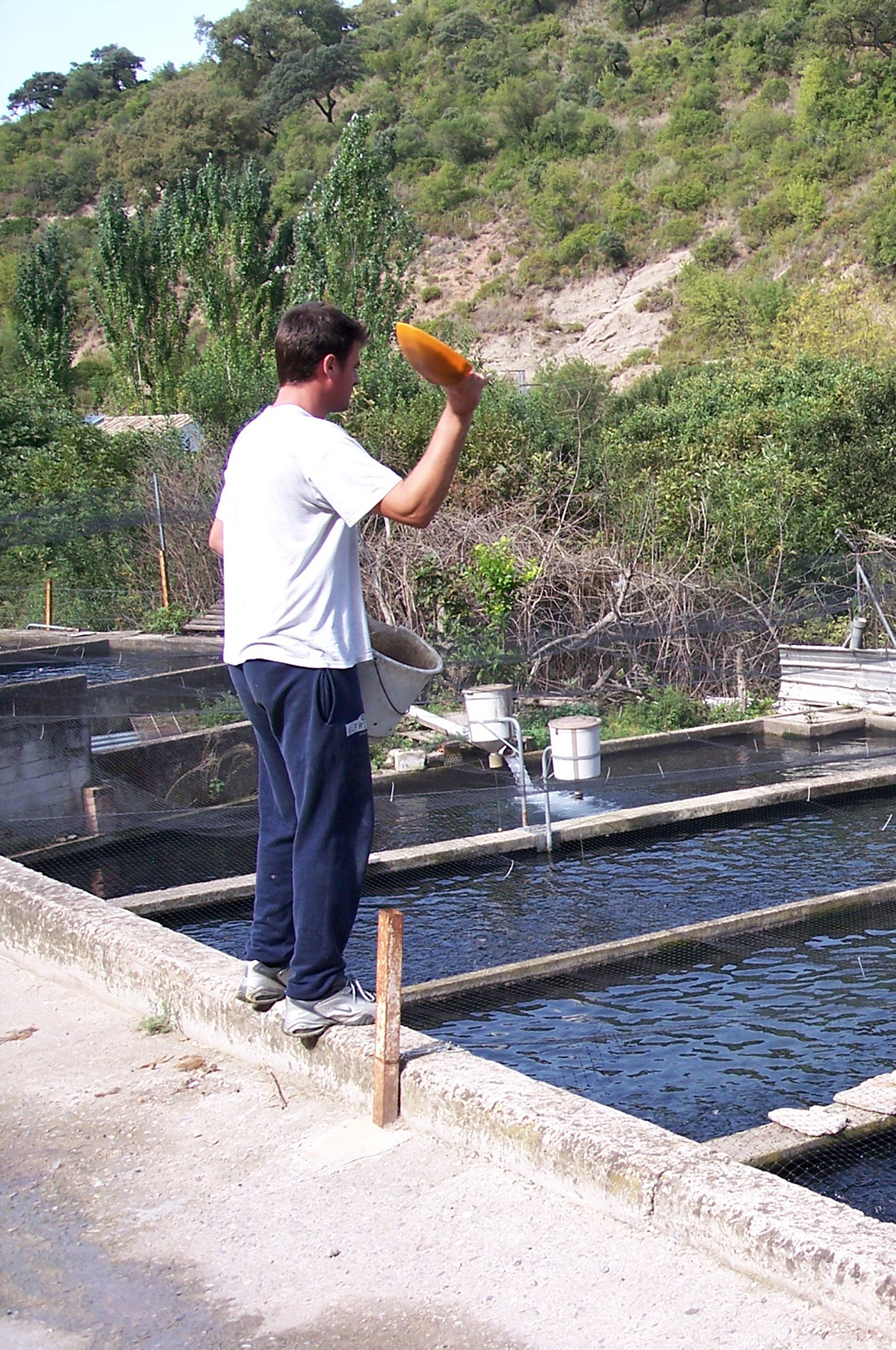 Hombre alimentando truchas