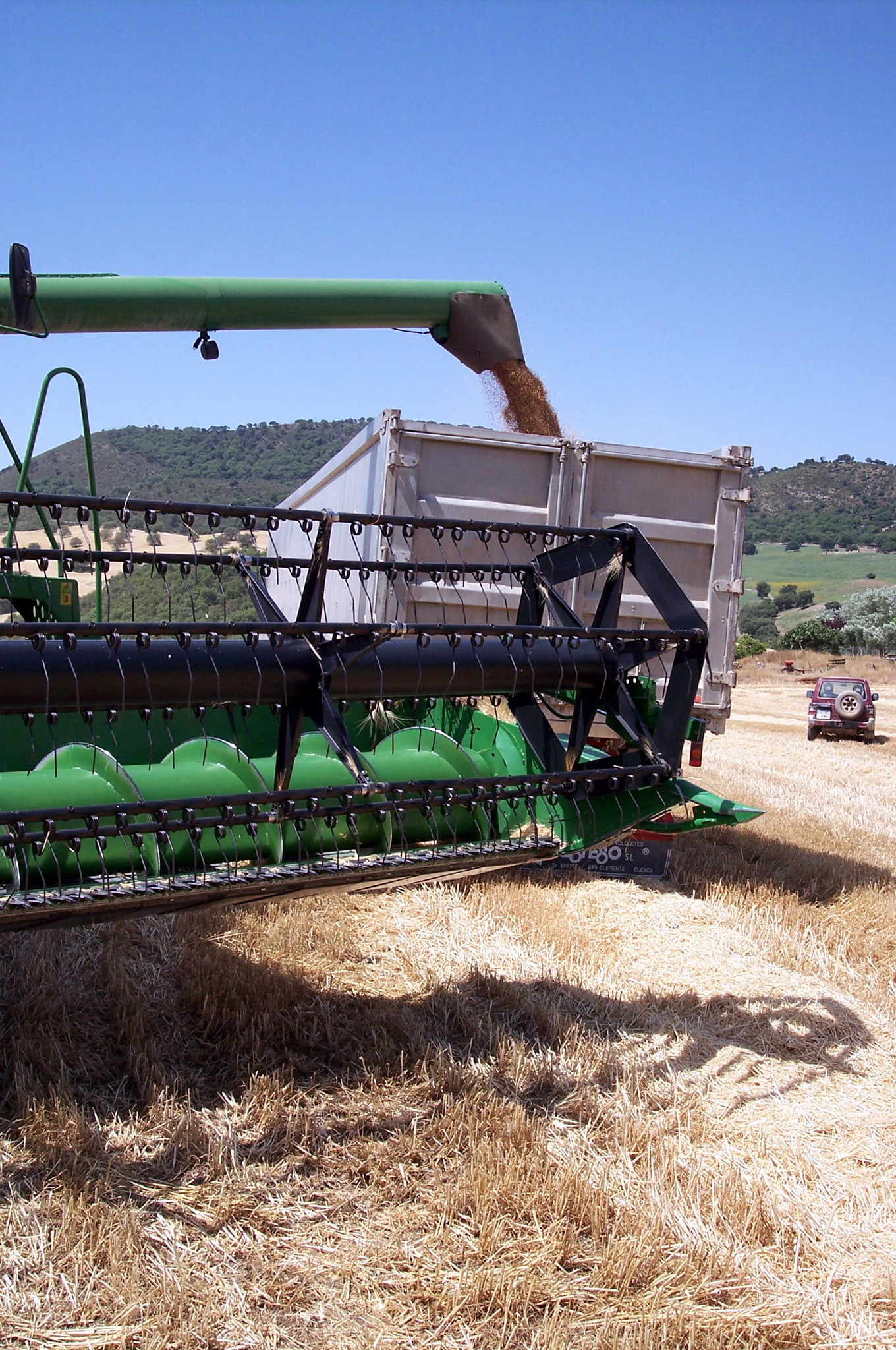 Cosechadora descargando trigo en un camión