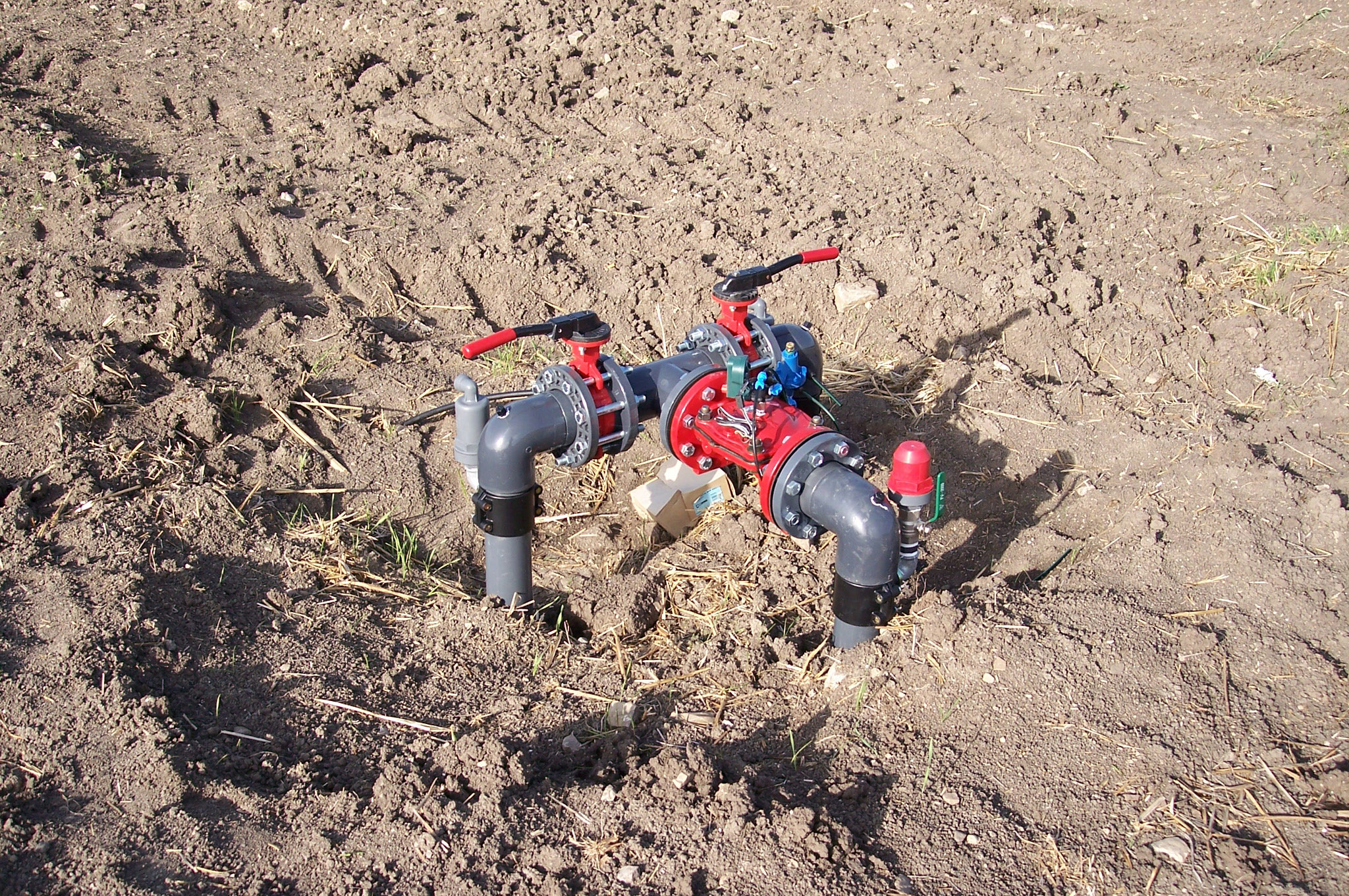 Salida de tubería y válvula de presión en una plantación de olivos