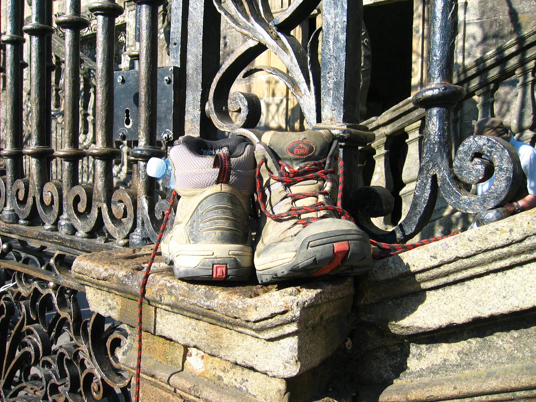 Botas de un peregrino en las rejas de la Plaza del Obradoiro, Santiago de Compostela, A Coruña