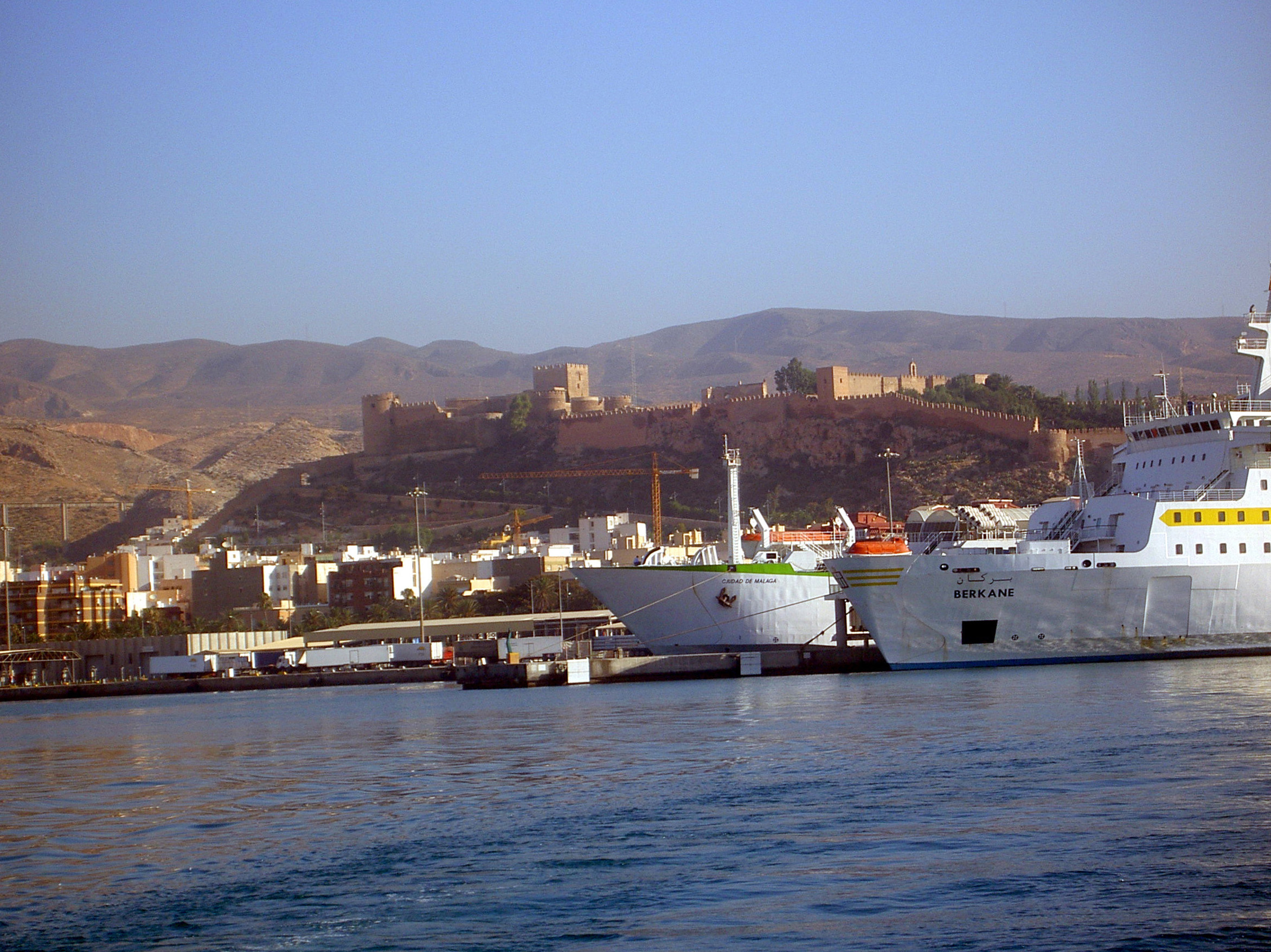 Puerto de Almería con la alcazaba al fondo y ferri en primer plano