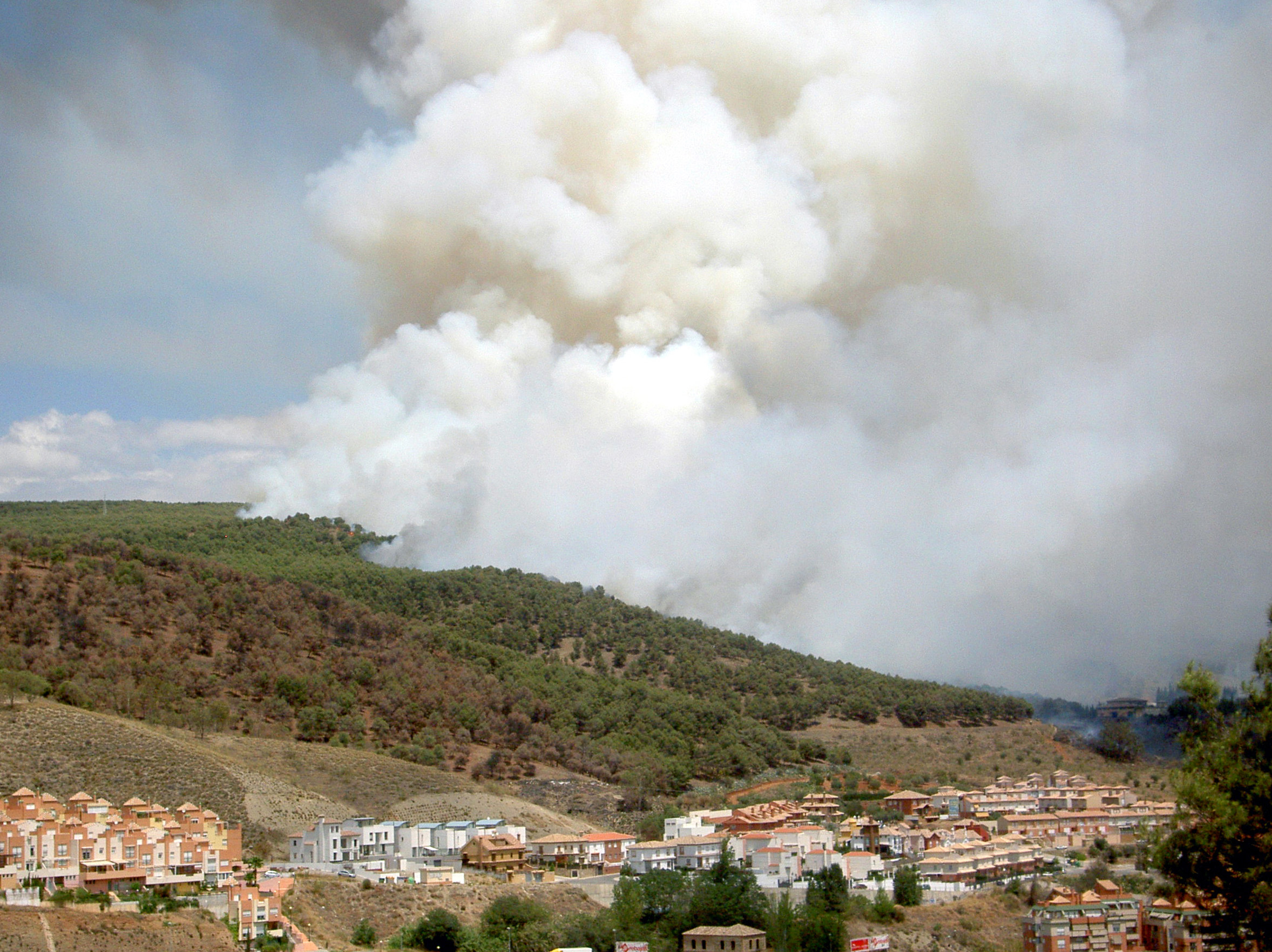 Vista de casas y montaña con humo causado por el incendio forestal en el LLano de la Perdiz, Granada