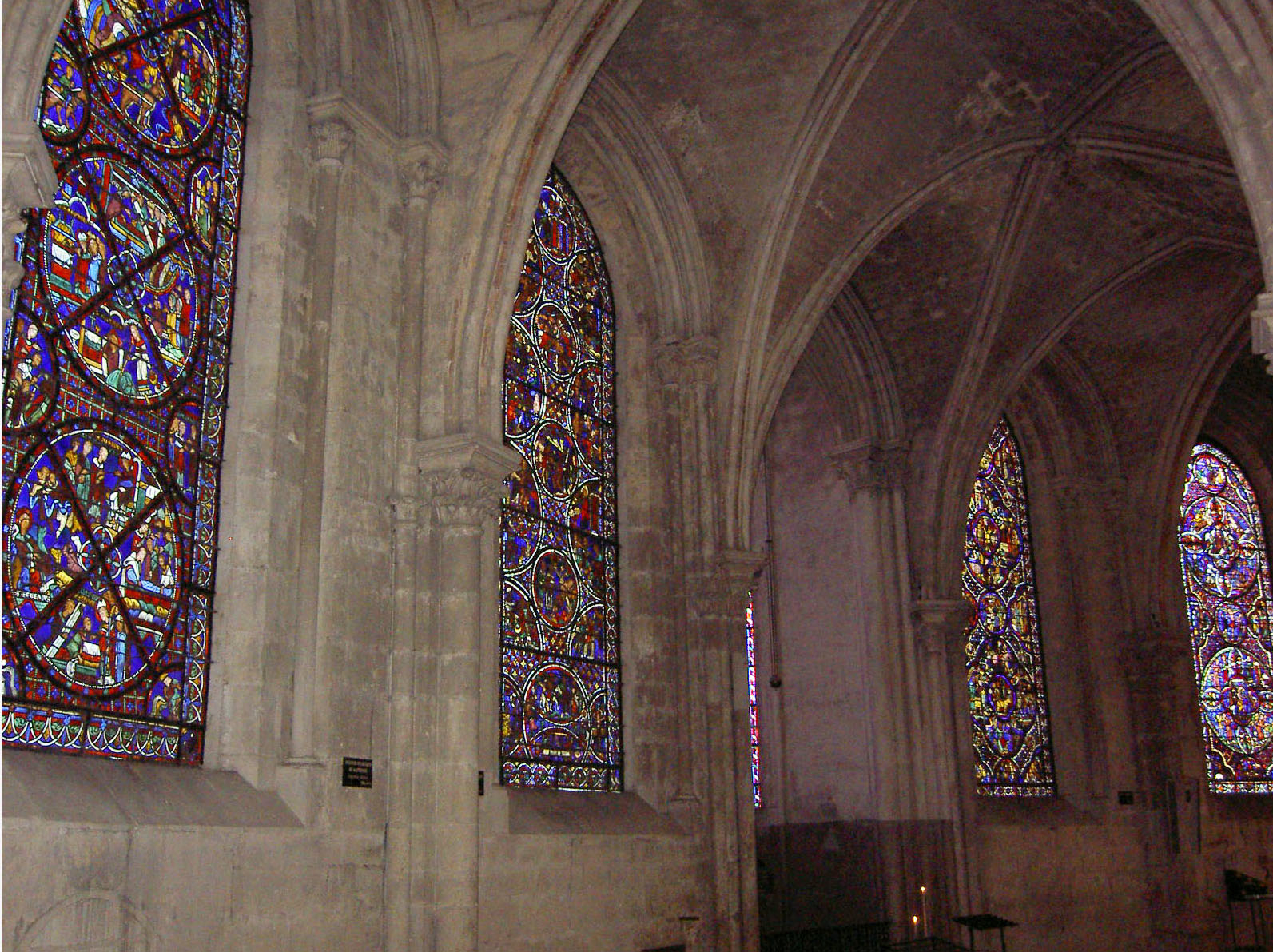 Vidrieras y bóveda de crucería de la catedral de estilo gótico Saint-Etienne de Bourges, Francia.
