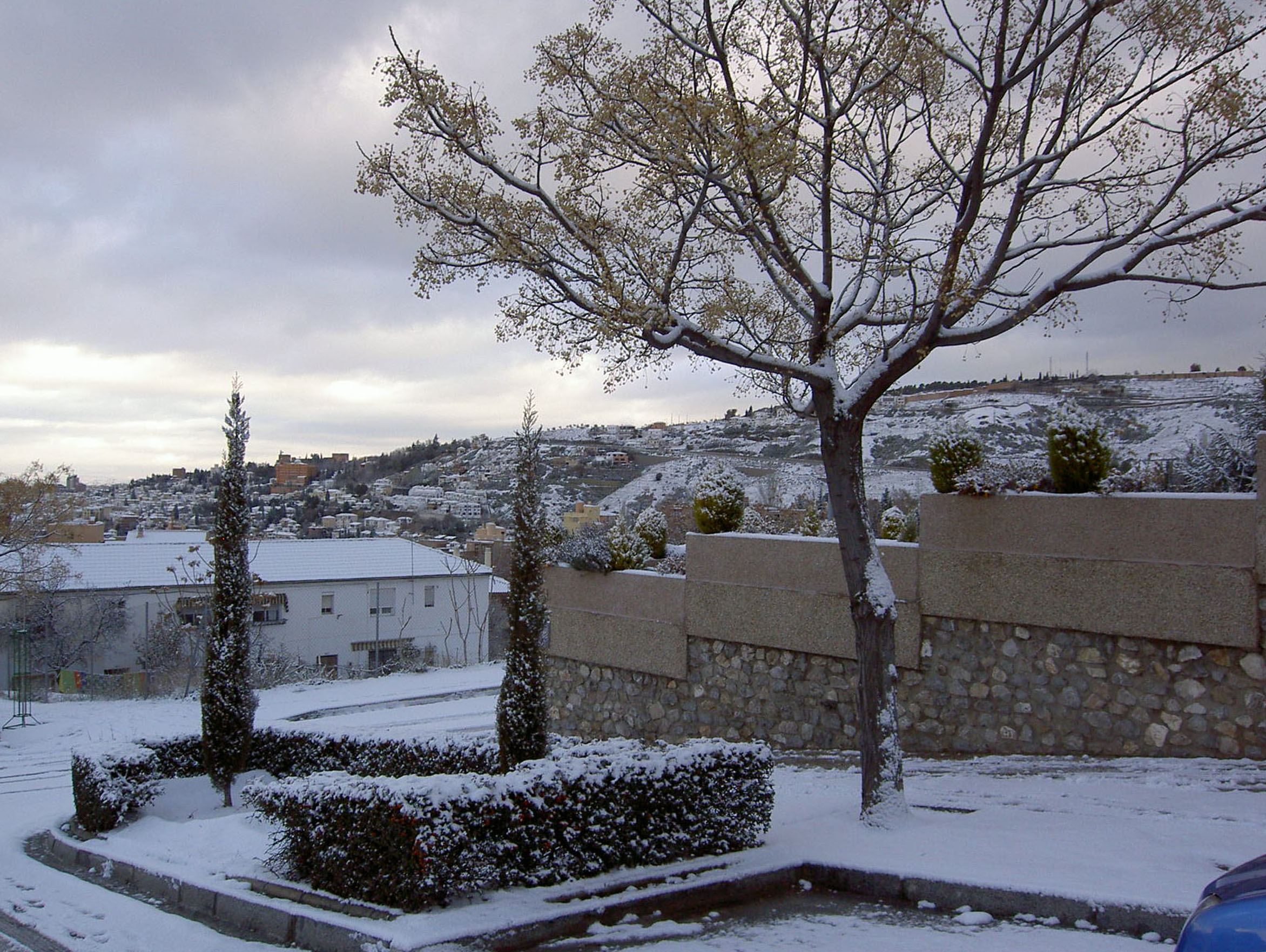 Vista con nieve y nublado del barrio Bola de Oro de la ciudad de Granada.
