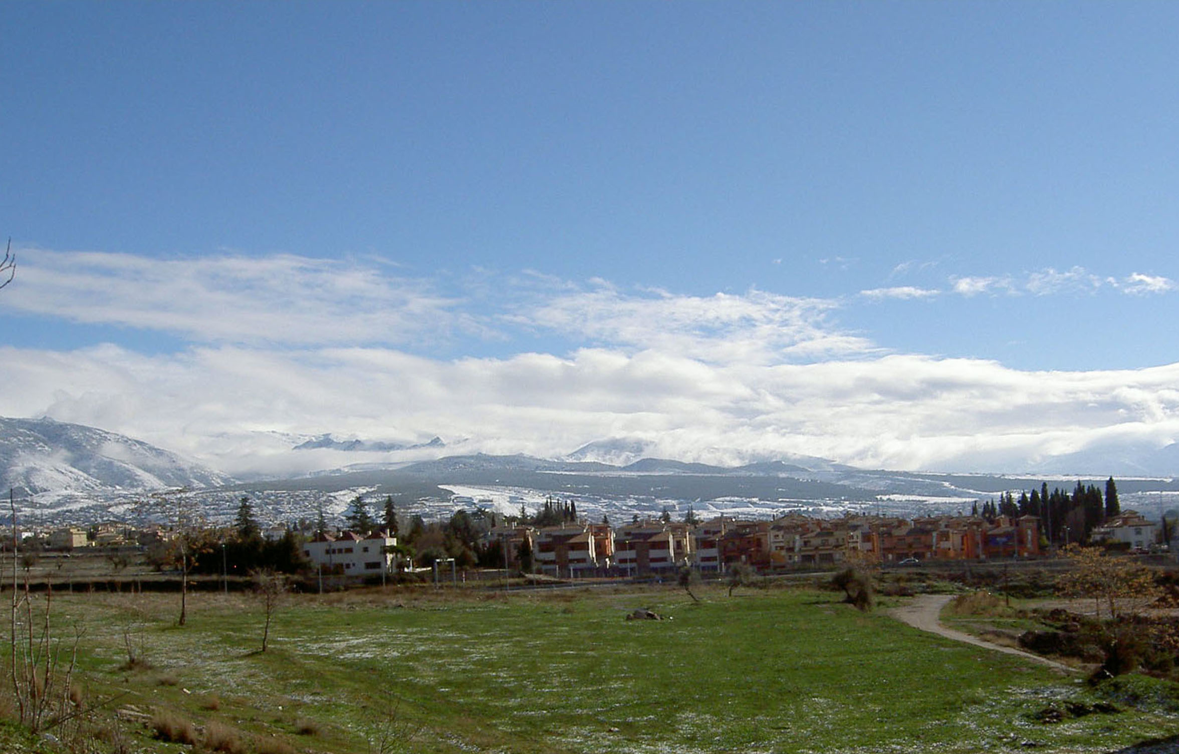 VIstade Granada, cielo azul con nubes y Sierra Nevada con nieve.