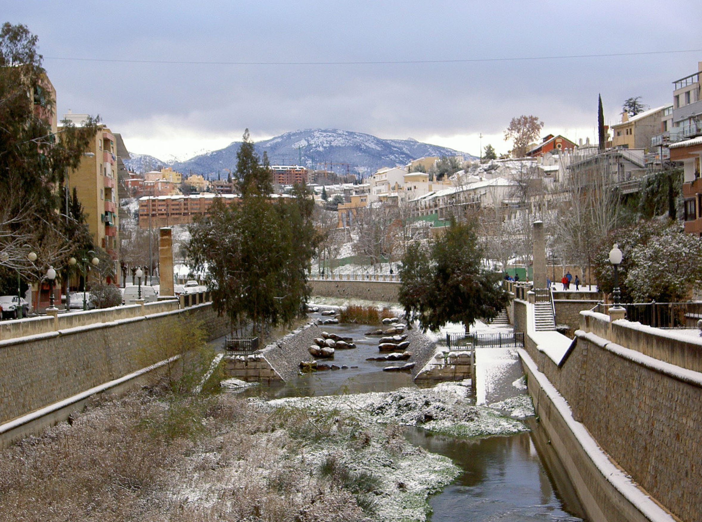 Río Genil y Paseo Fuente de la Bicha, Granada, con nieve.