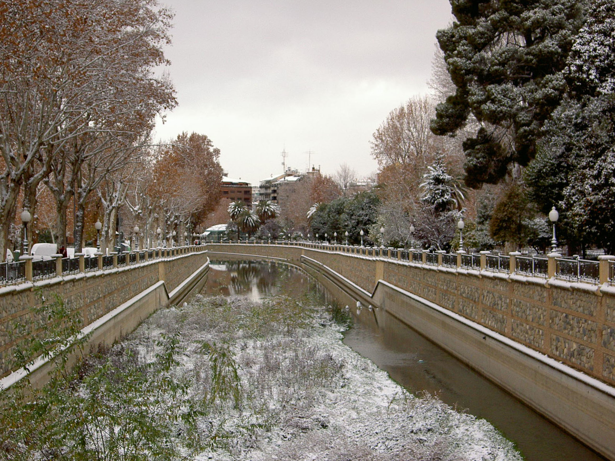 Vistas del río Genil y del Paseo del Salón, Granada, con nieve.