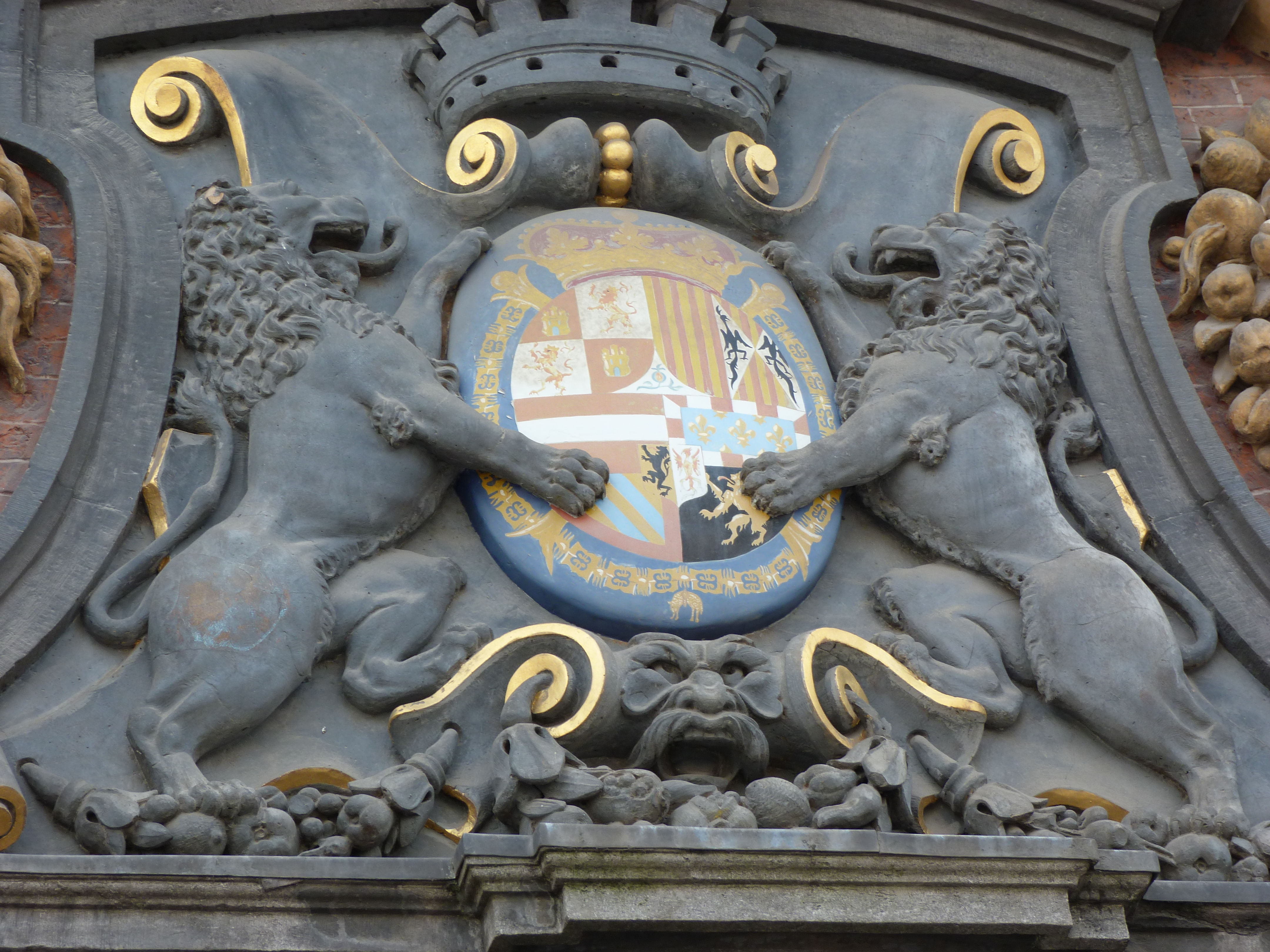 detalle del escudo del edificio de la bolsa de Lille. Su arquitectura es típica del estilo renacentista flamenco, comparable a la de Amberes. Hasta 1923 fue, ante todo, un lugar de comercio para los comerciantes de Lille, encarnado en la estatua de Mercurio, dios del comercio, que corona el campanario del edificio.