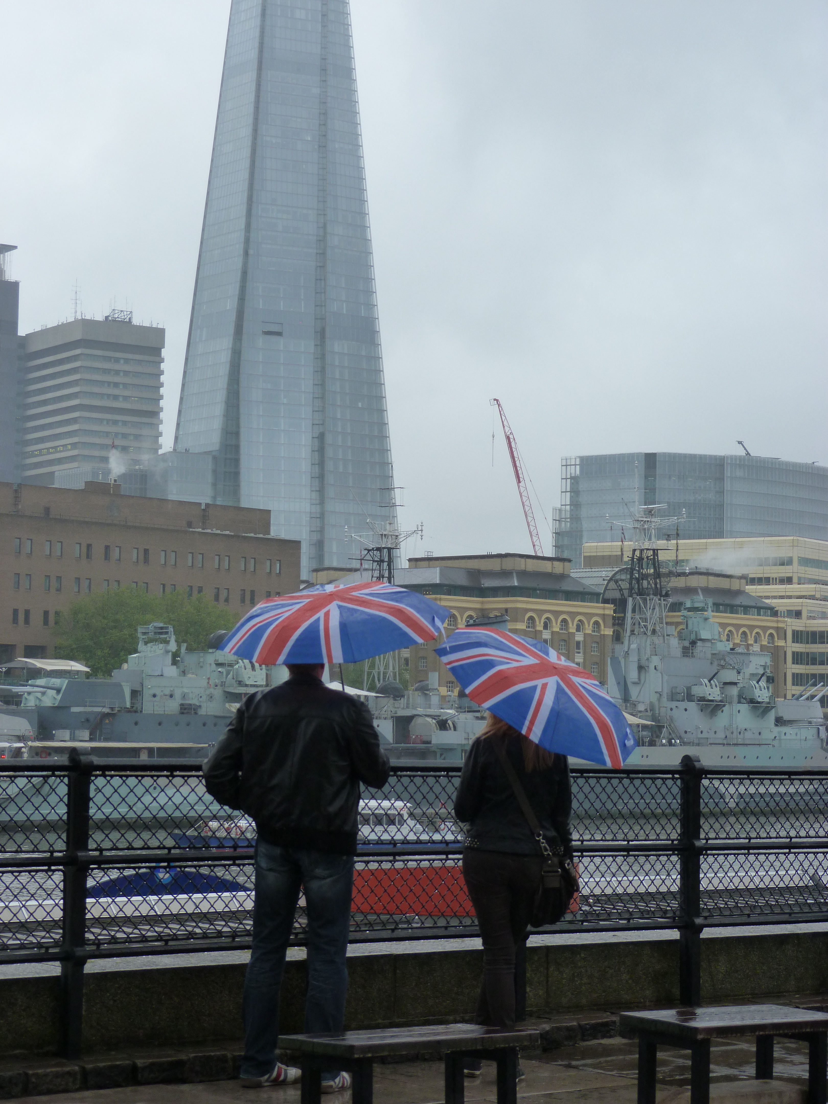 Pareja con la bandera del Reino Unido contemplando la nueva torre de Londres con el Támesis