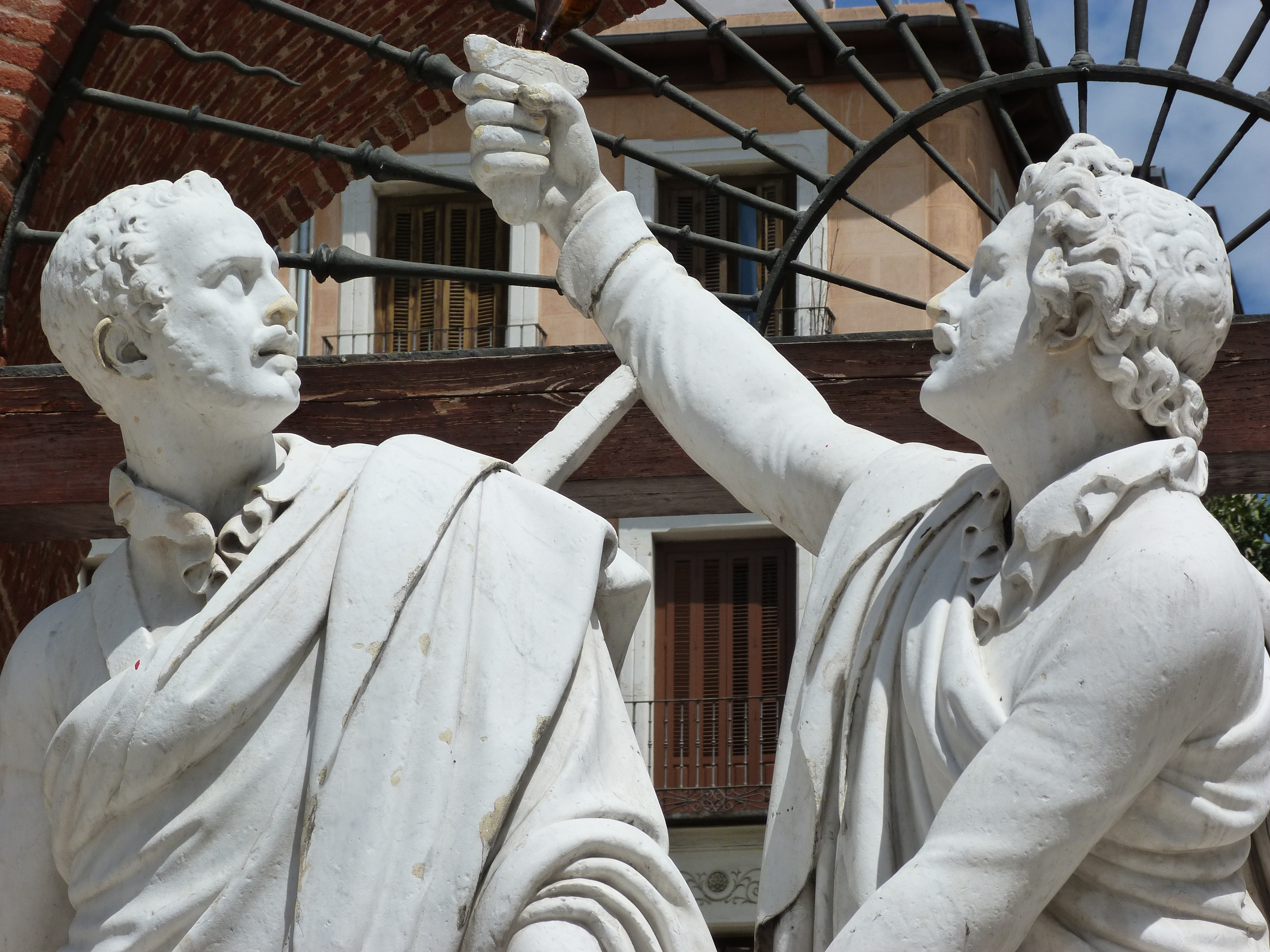 En esta escultura se representa a Daoiz y Velarde hacían el juramento de morir en defensa de la independencia española. La escultura fue realizada en 1891 por Mariano Benlliure, actualmente colocada en la plaza del Rey.