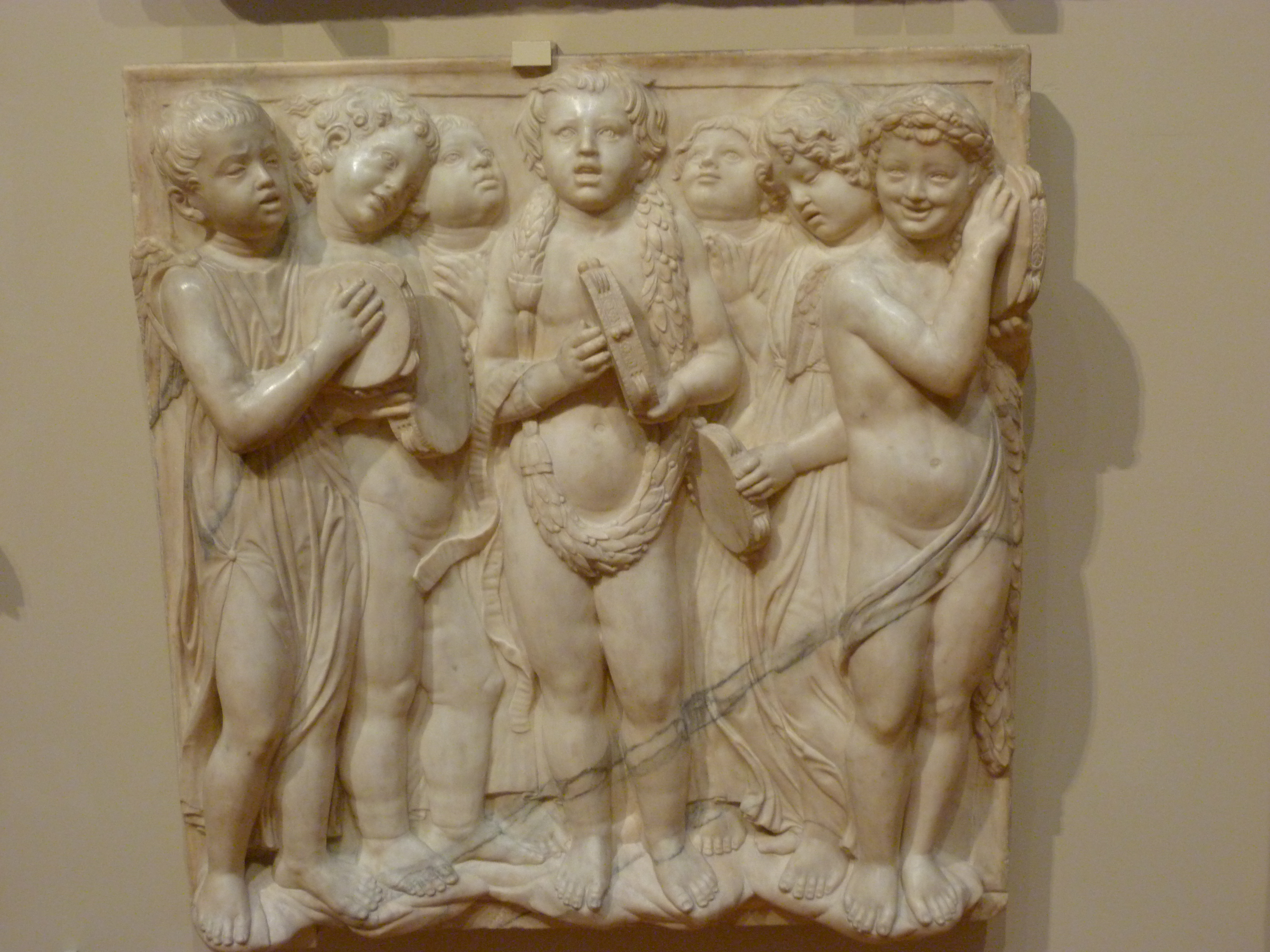 Relieve grupo de niños acompañados de panderetas y címbalos.