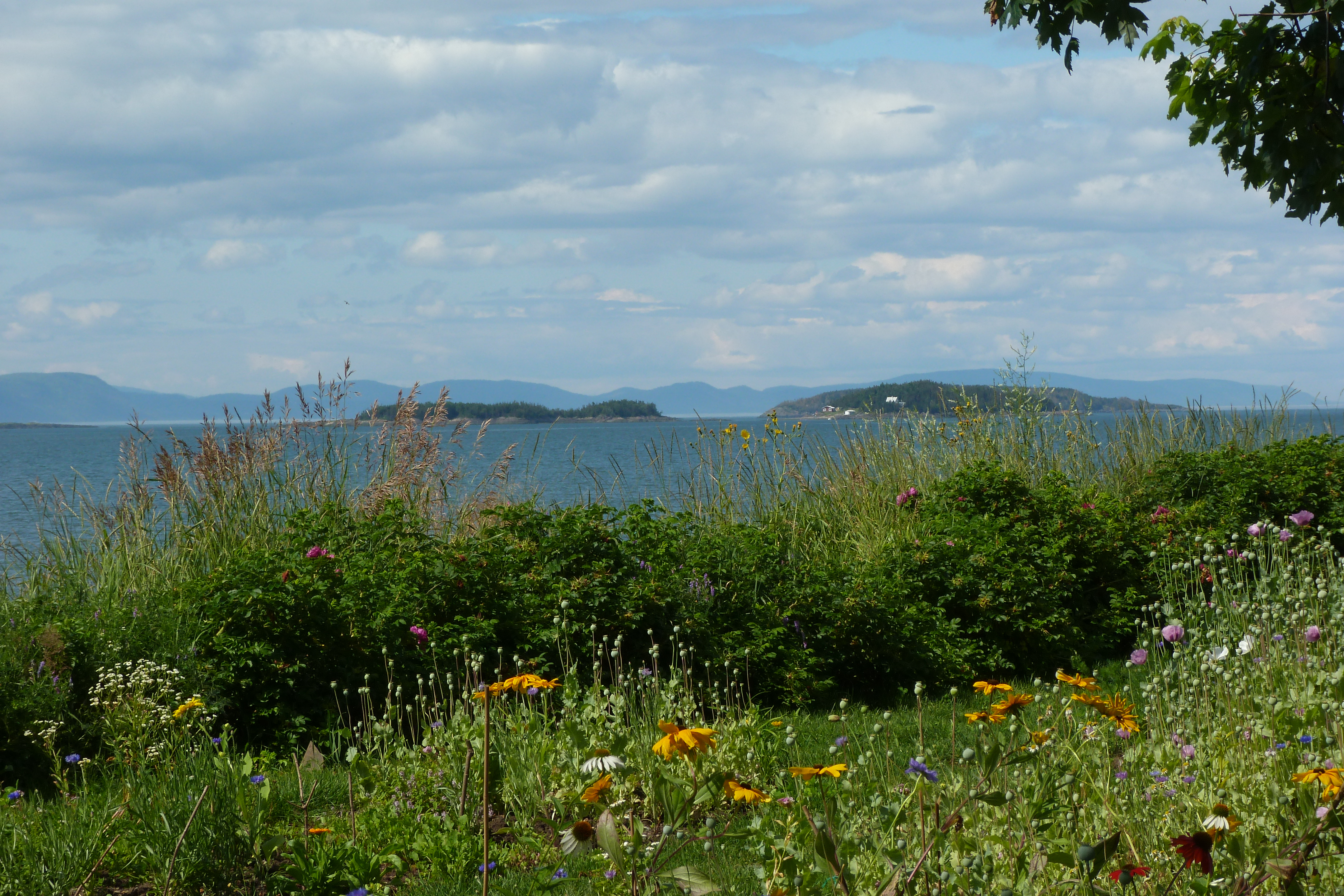 Vista del rio San Lorenzo a su paso por la ciudad de Kamouraska, Quebec y vegetación. Es uno de los principales ríos de Norteamérica, el colector de los Grandes Lagos que conecta con el océano Atlántico, en el golfo de San Lorenzo. En su primer tramo forma la frontera natural entre Estados Unidos y Canadá, bordeando el oeste de la provincia de Ontario, y luego se adentra en Quebec atravesándolo totalmente. Pertenece al sistema lacustre de Lawrence.