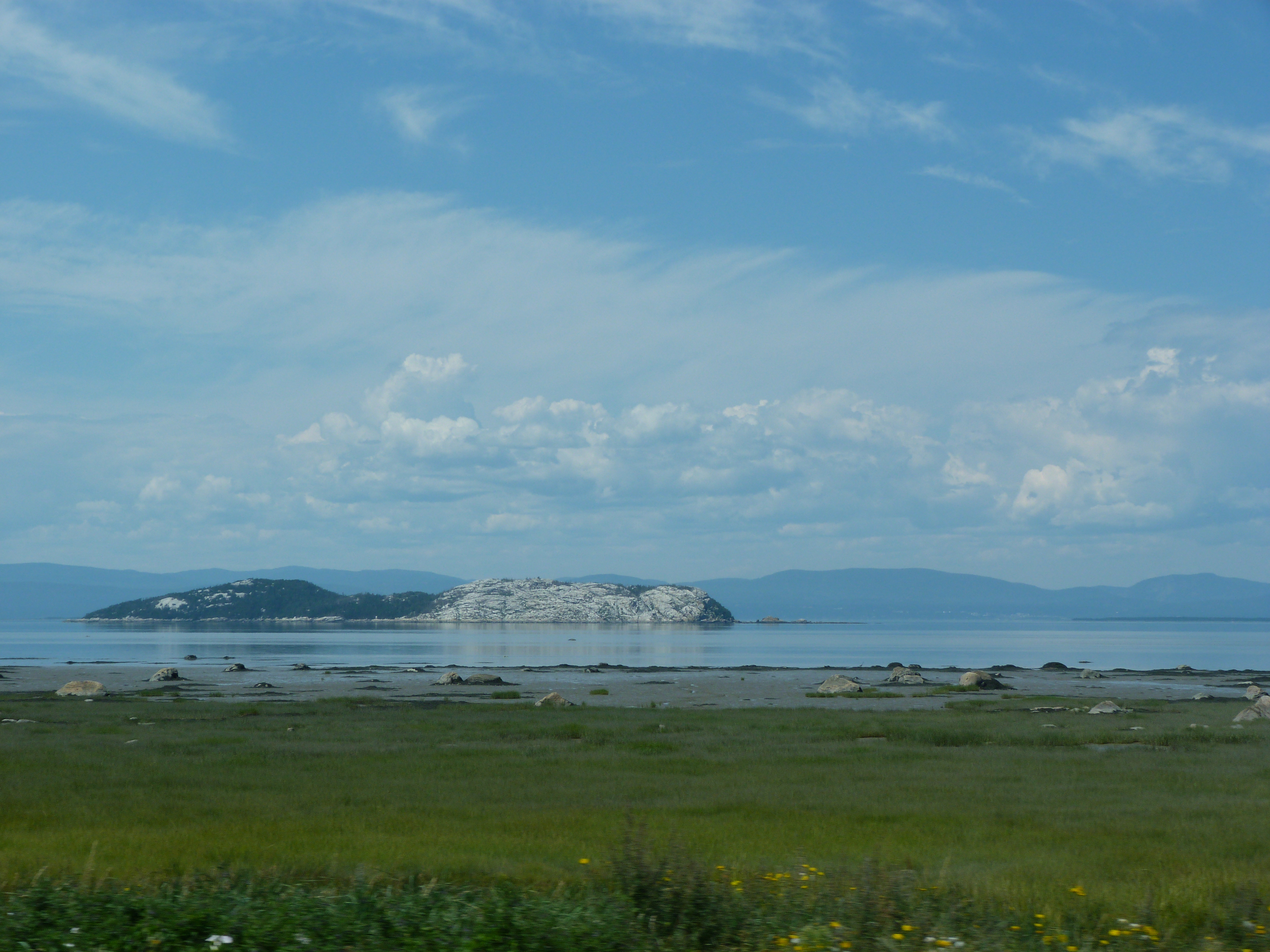 Vista del rio San Lorenzo a su paso por la ciudad de Kamouraska, Quebec y las islas. Es uno de los principales ríos de Norteamérica, el colector de los Grandes Lagos que conecta con el océano Atlántico, en el golfo de San Lorenzo. En su primer tramo forma la frontera natural entre Estados Unidos y Canadá, bordeando el oeste de la provincia de Ontario, y luego se adentra en Quebec atravesándolo totalmente. Pertenece al sistema lacustre de Lawrence.