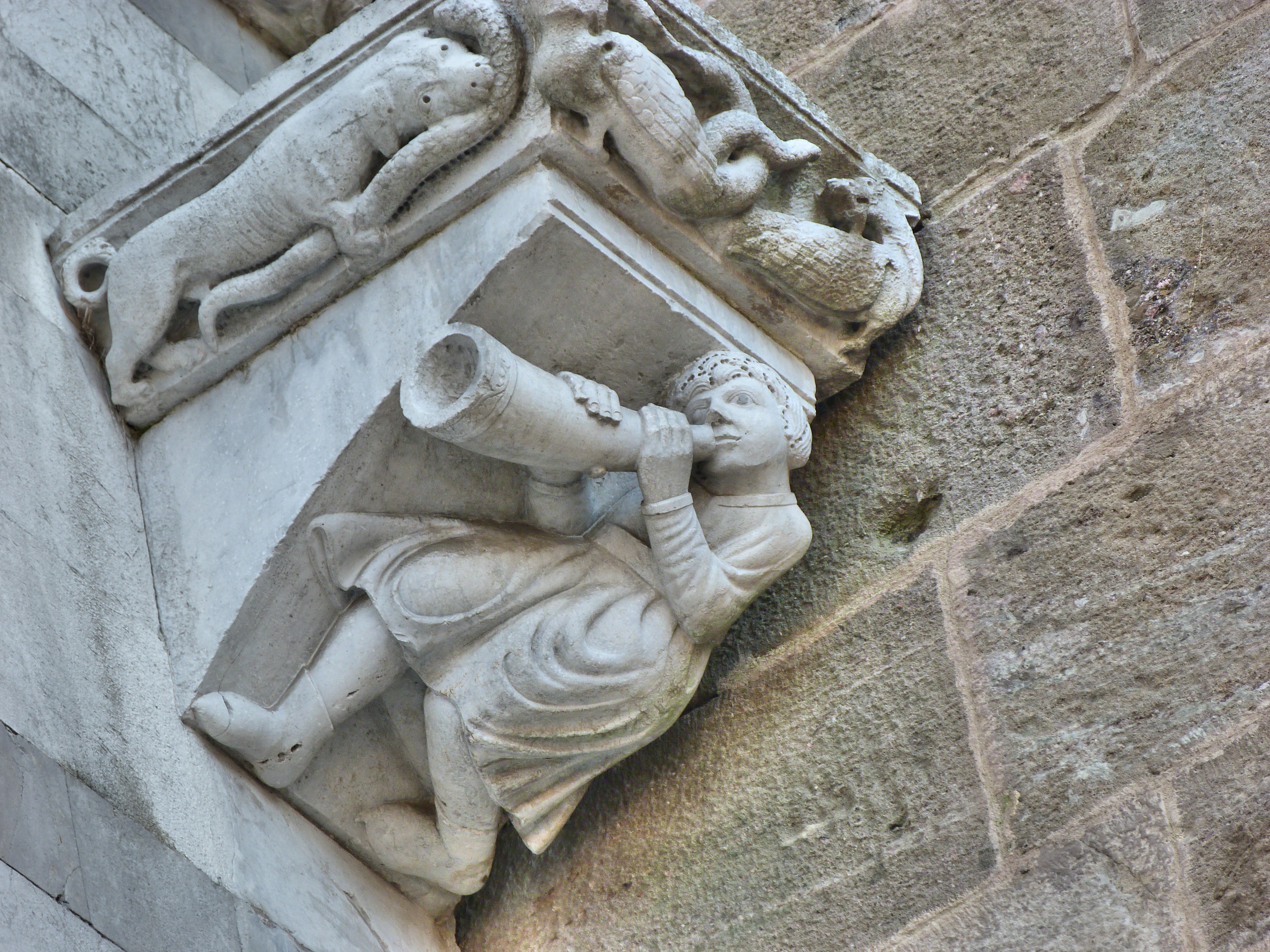 Detalles decorativos de un músico en la fachada de la catedral de San Martín (Lucca)