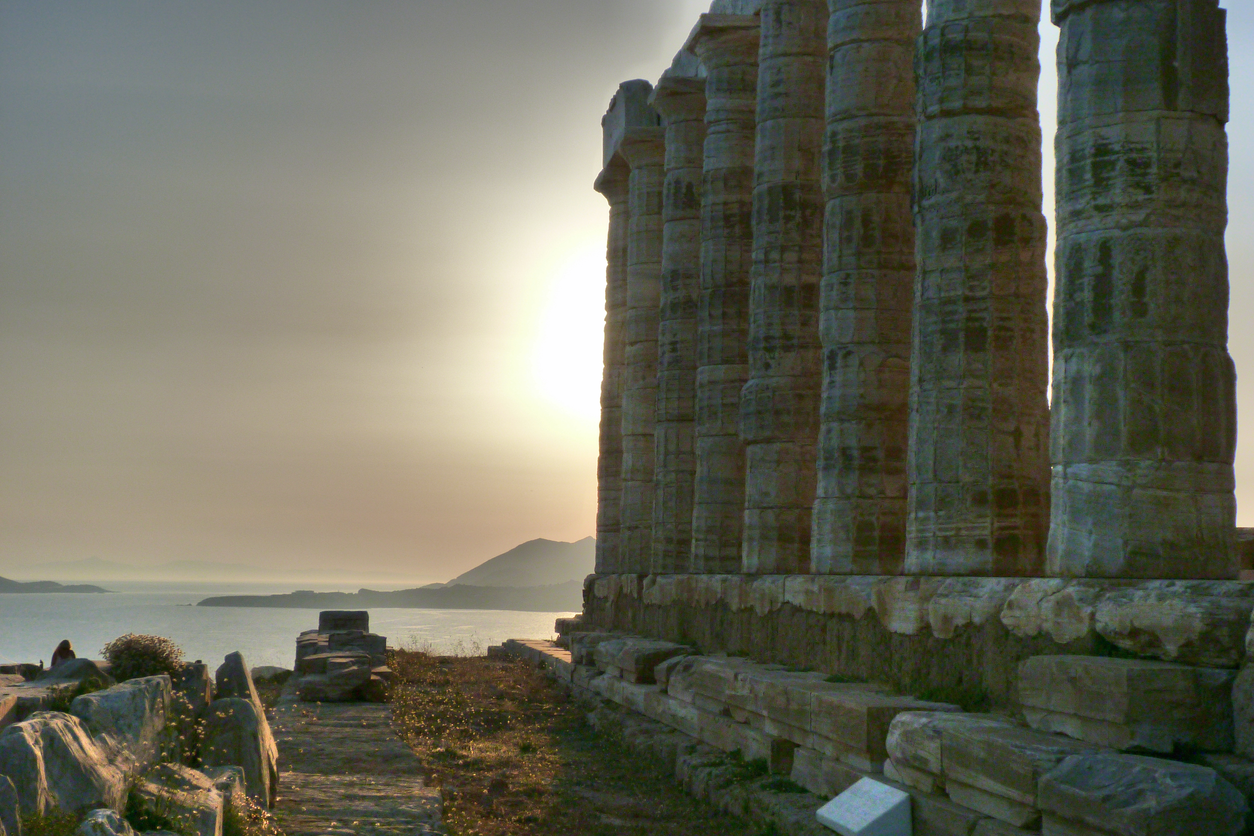 Atardecer en el templo de Poseidón. El antiguo templo griego de Poseidón en el cabo Sunio, construido entre 444–440 a. C., es uno de los principales monumentos de la Edad de Oro de Atenas. Se alza sobre el mar a una altura de casi 60 m