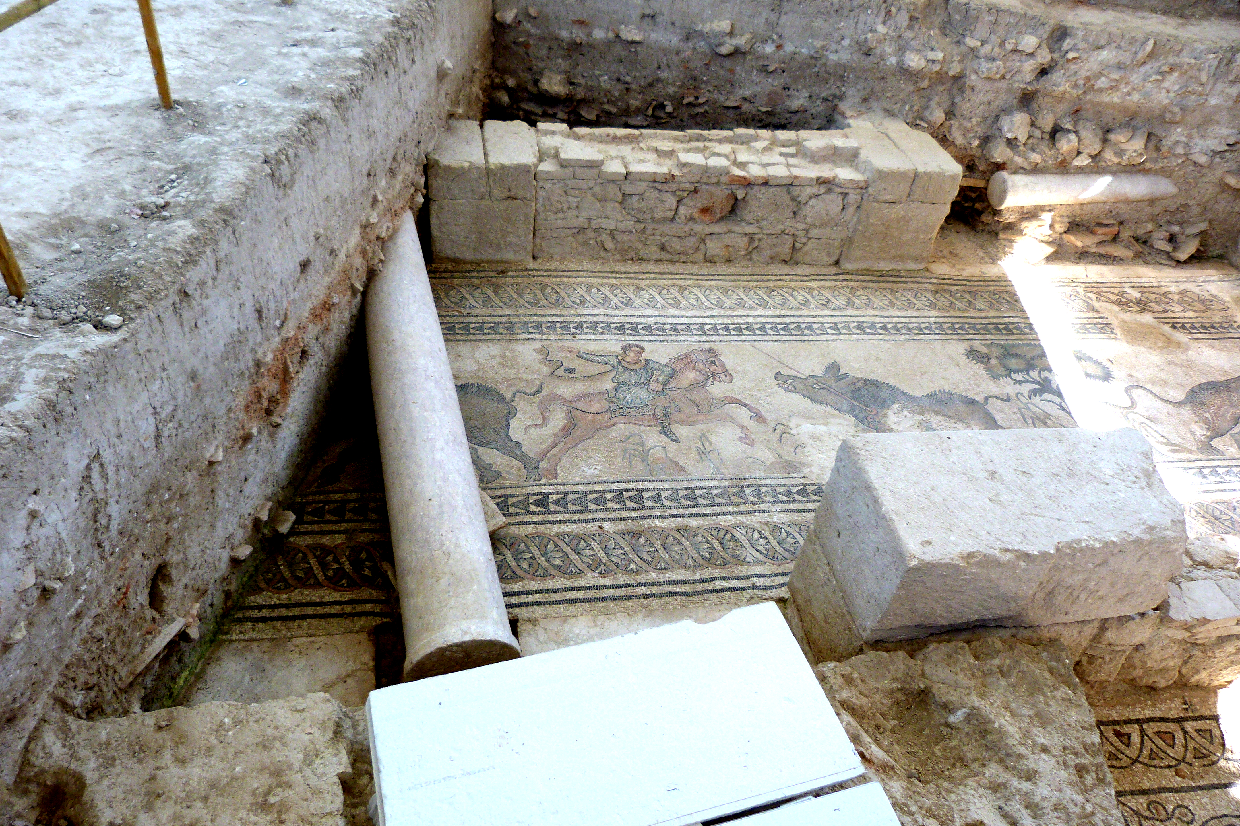 Mosaico con escena de caza de jabalí en la villa romana de El Salar, Granada