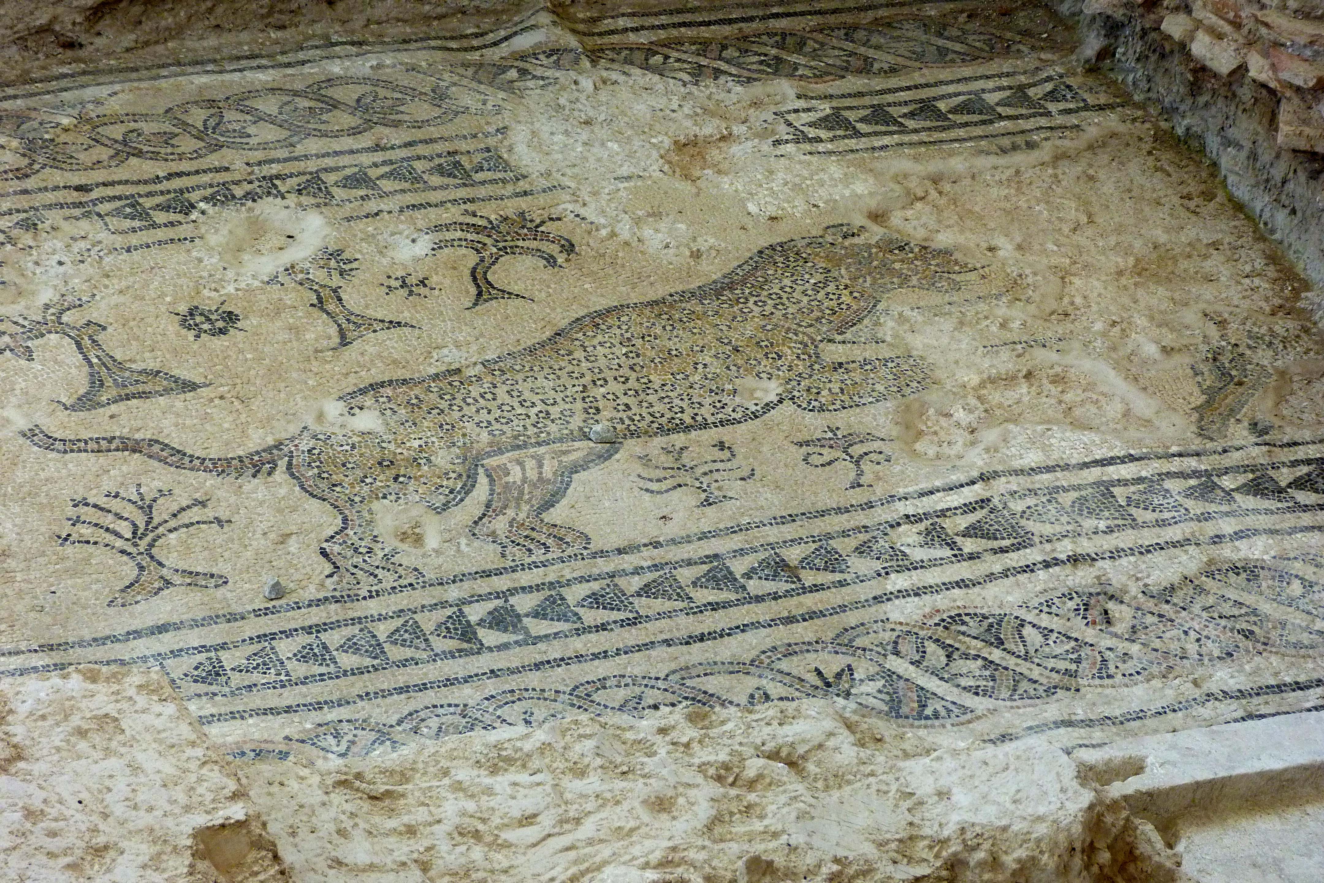 Mosaico de felino en la villa romana de El Salar, Granada.