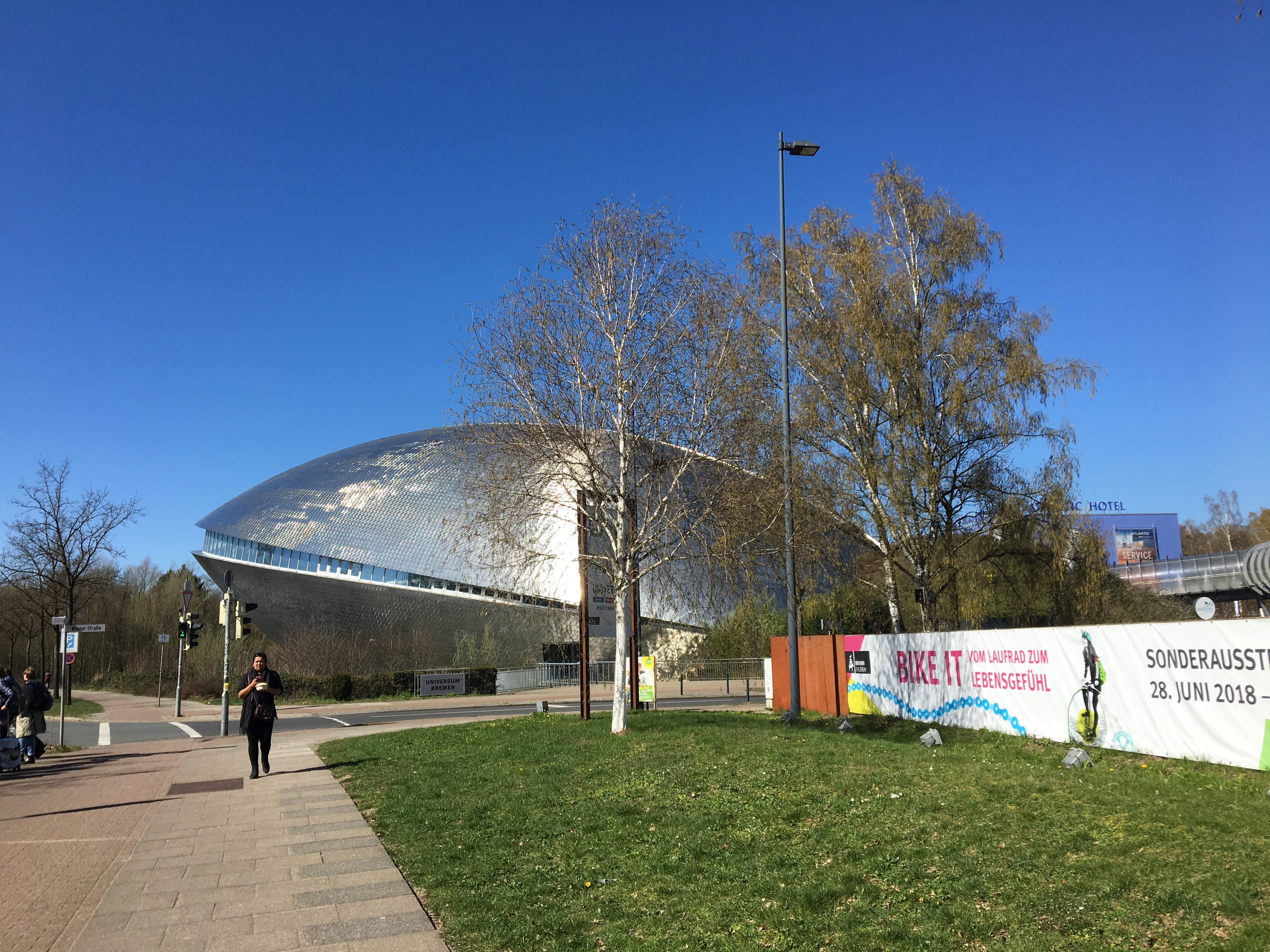 Vista exterior del museo de la ciencia o Universum Bremen. El exterior del museo de ciencias está construido a base de 40.000 grandes piezas de acero inoxidable, con formas que asemejan las de una ballena o un mejillón gigante.