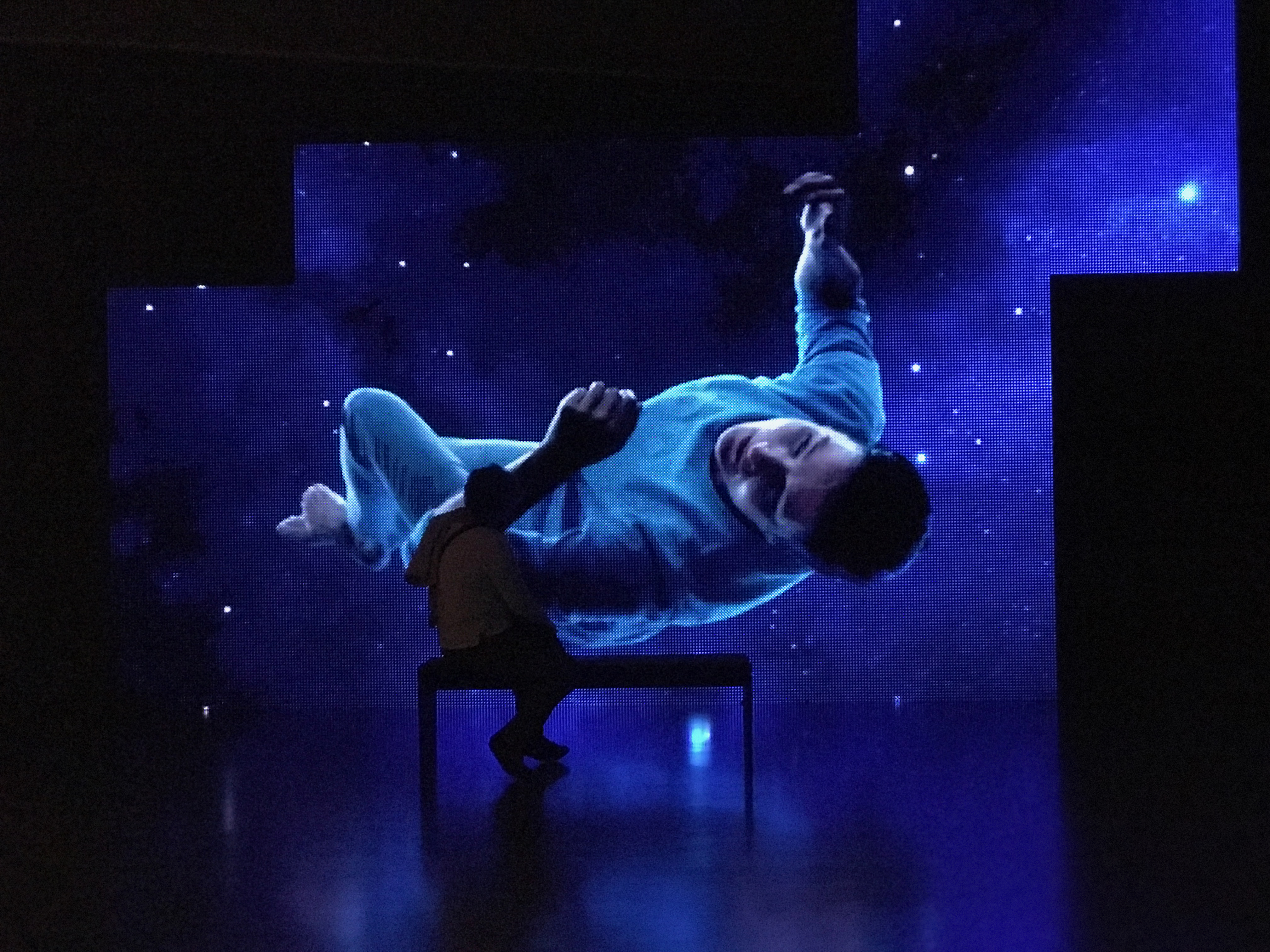 Exposición de un chico flotando en el espacio iluminado en el museo de arte contemporáneo de Vilnius