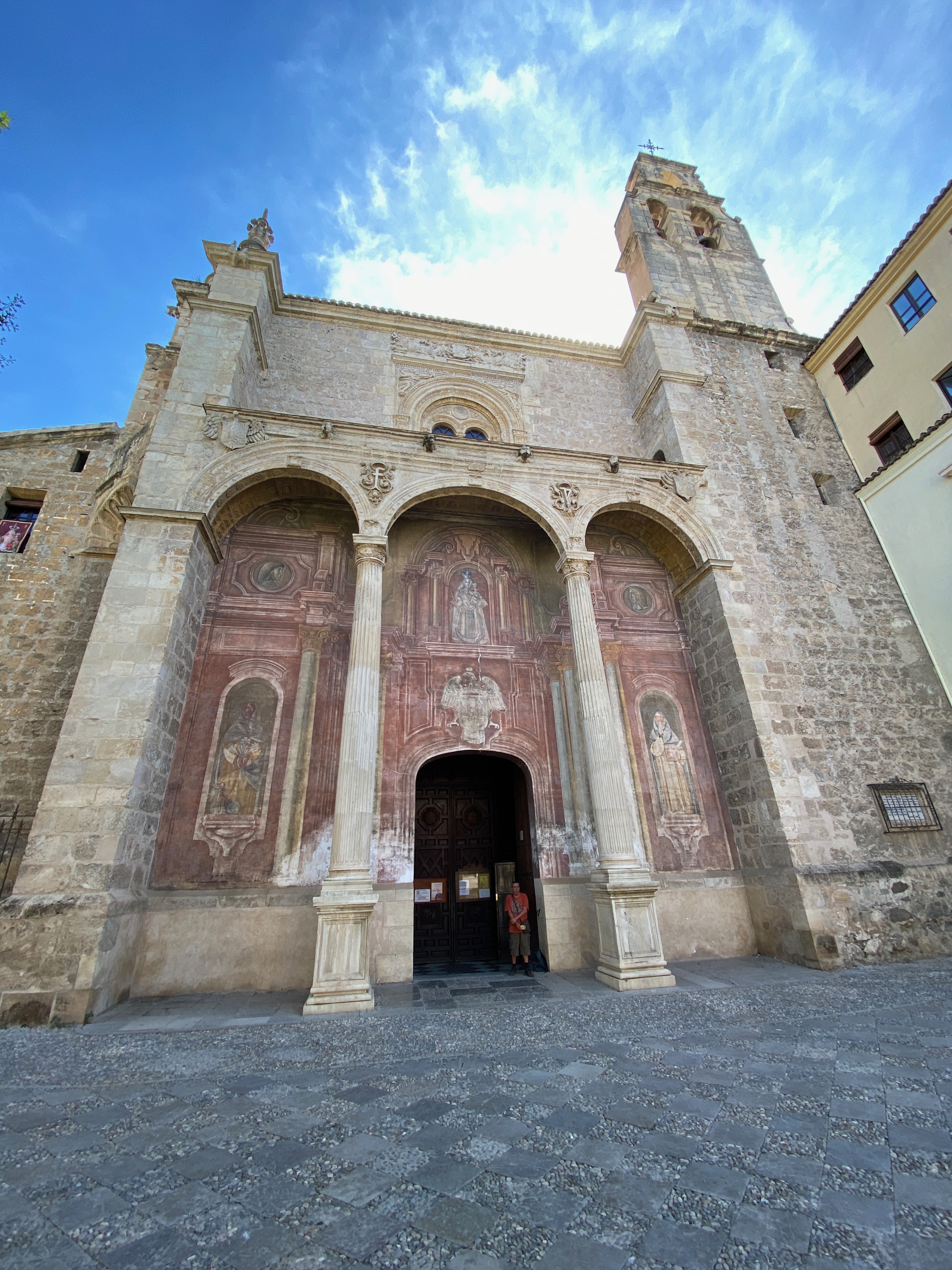 Iglesia de Santo Domingo (Granada). Del exterior destaca su peculiar fachada a los pies del templo, enmarcada entre dos contrafuertes y compuesta por un pórtico de piedra con tres arcos de medio punto sobre columnas en cuyas enjutas se muestran las iniciales de los Reyes Católicos, "F" e "Y". Tras las columnas destacan las pinturas que decoran la fachada con arquitectura figurada donde se presenta una hornacina con la Virgen del Rosario, titular de la iglesia y copatrona de la ciudad de Granada, así como su campanario. En uno de los lados aparece el escudo de los reyes con el águila de San Juan y en el otro el del emperador Carlos con el águila bicéfala y el conocido lema "Tanto monta" en el centro. Sobre el pórtico de entrada se encuentra una bella ventana enmarcada por un arco que cobija dos arcos menores con parteluz, cuya parte superior se encuentra decorada con victorias esculpidas.