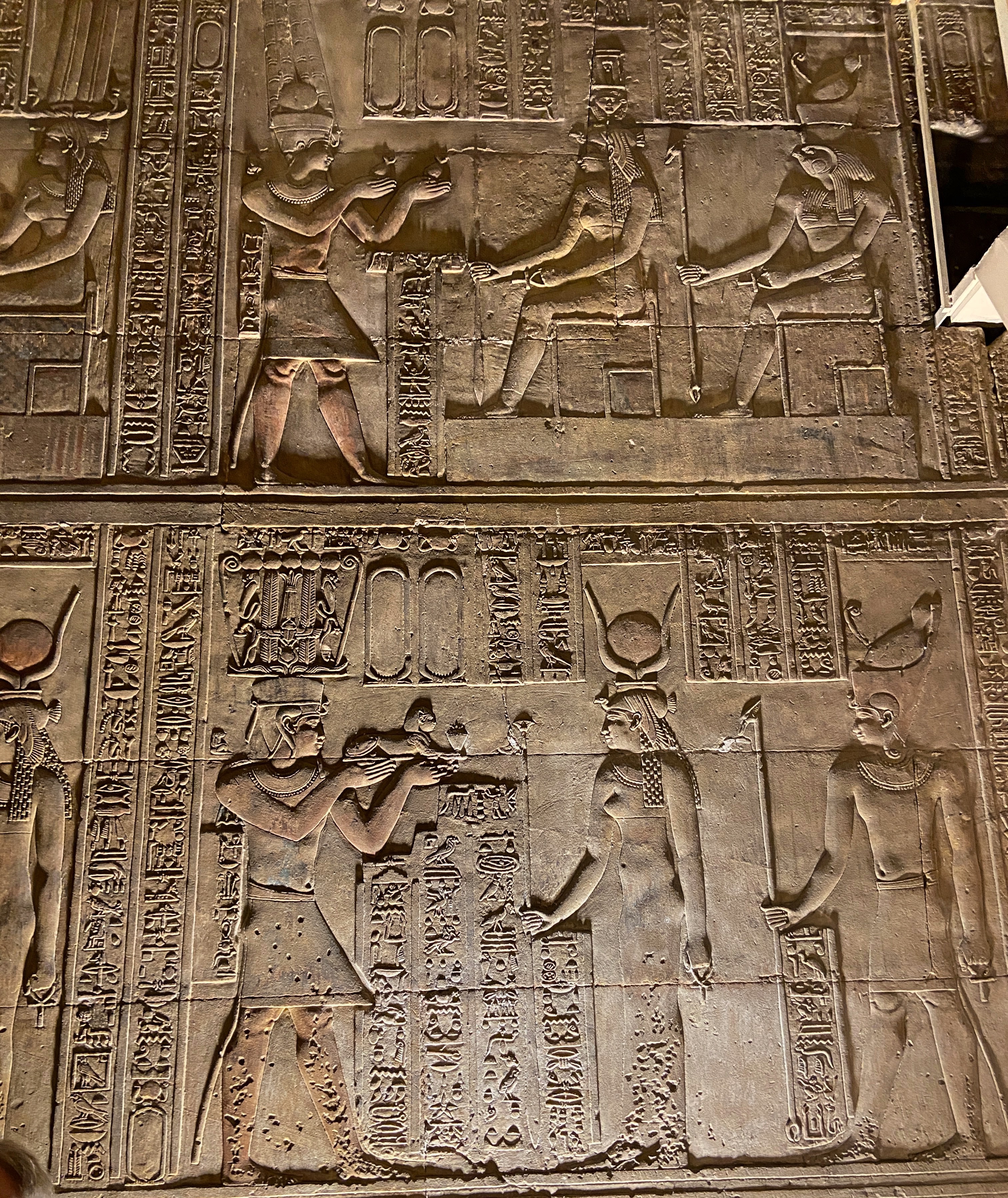 Relieves de ofrendas a la diosa hathor en el interior del templo de Hathor en Dendera