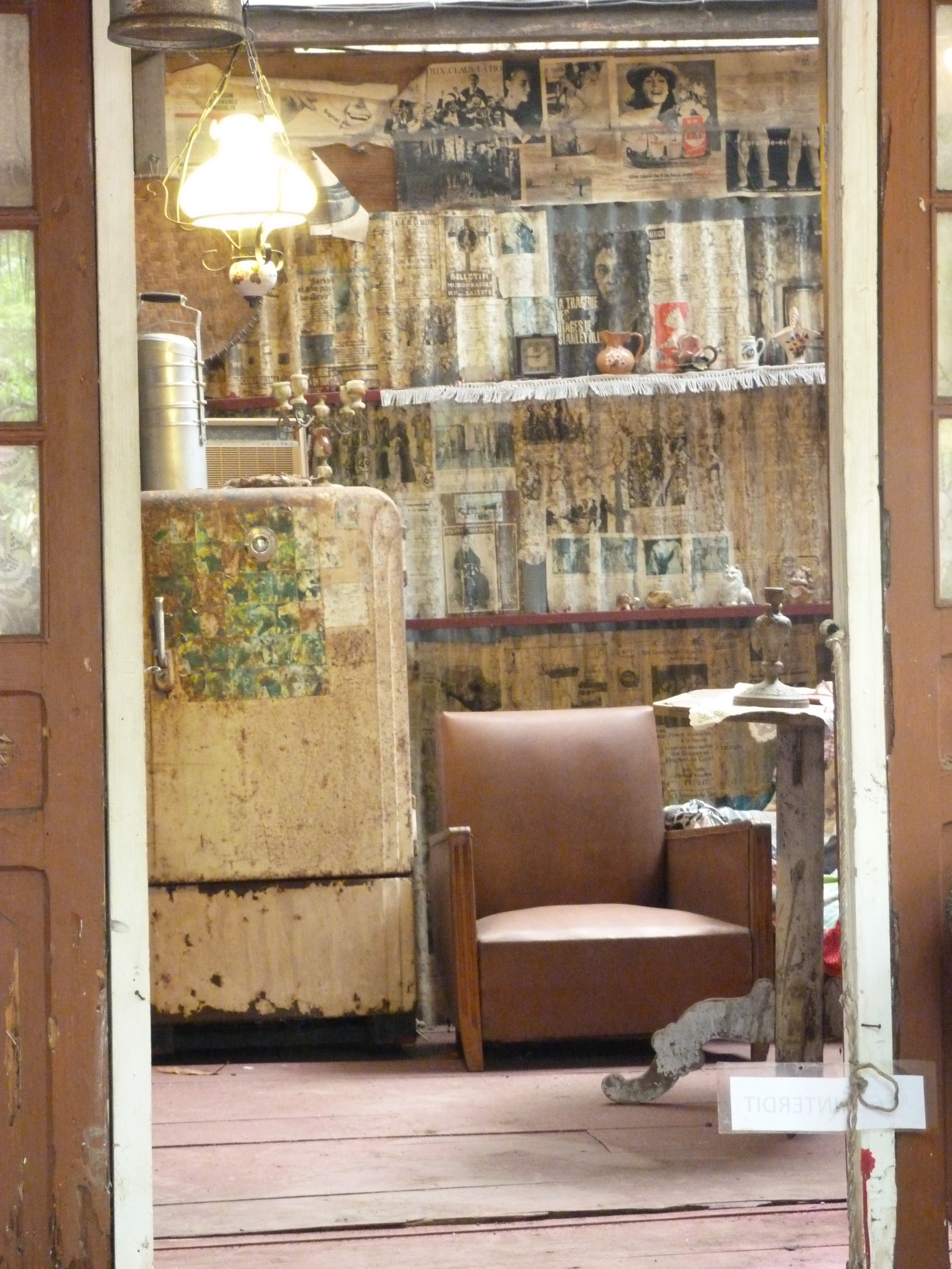 Habitación vintage, antiguo frigorífico, sillón y póster tonos pastel