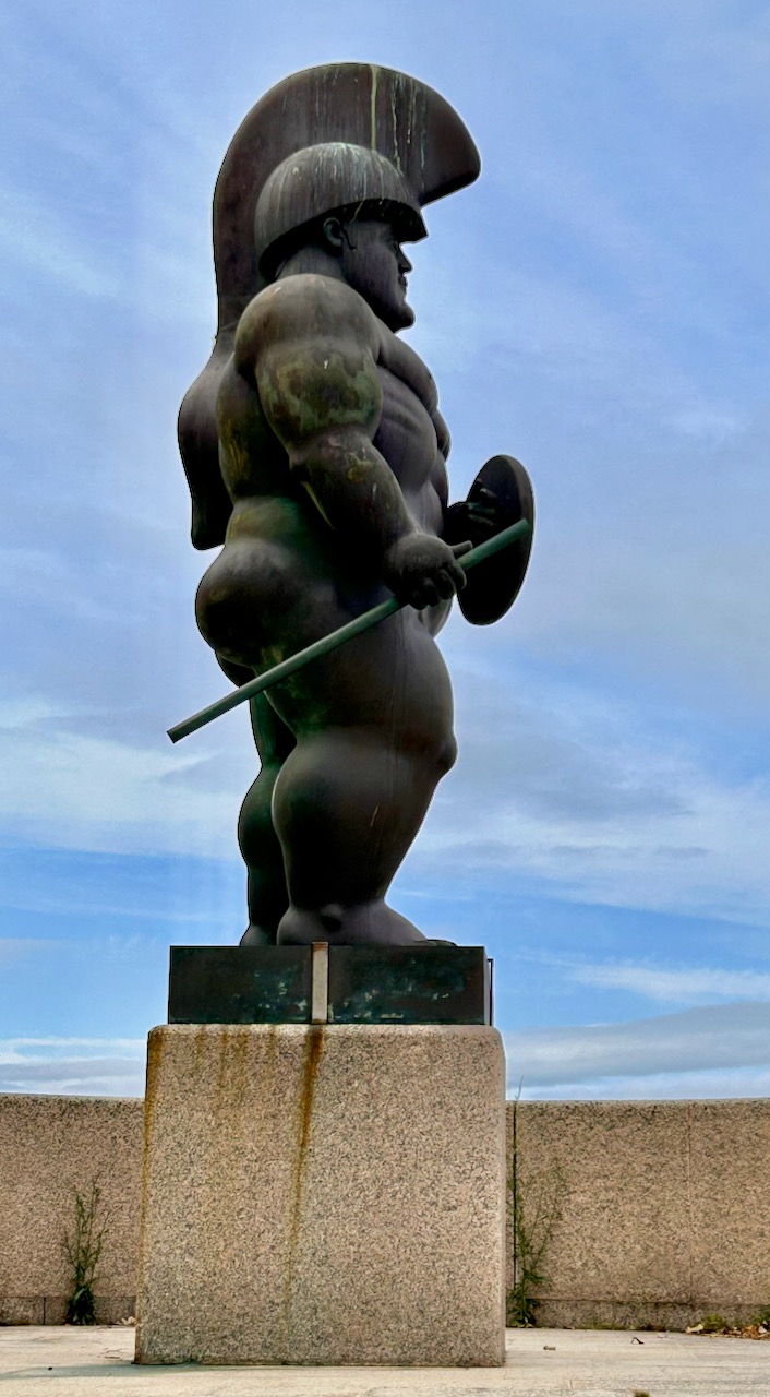 Vista perfil de la escultura soldado romano de Fernando Botero en La Coruña