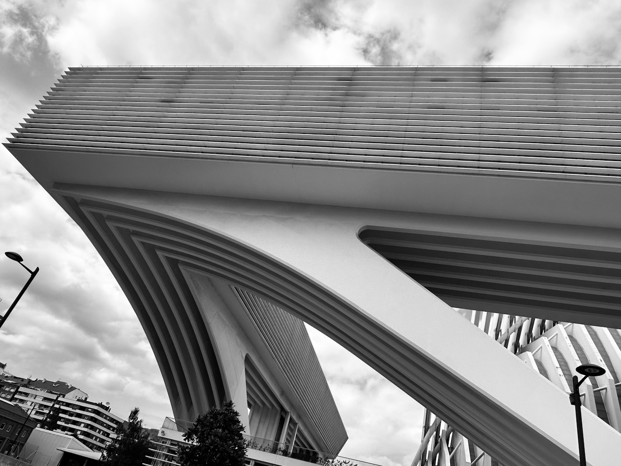 Fotografía en blanco y negro, Detalle del exterior, fachada del Palacio de Exposiciones y Congresos de Oviedo, obra del arquitecto valenciano Santiago Calatrava.