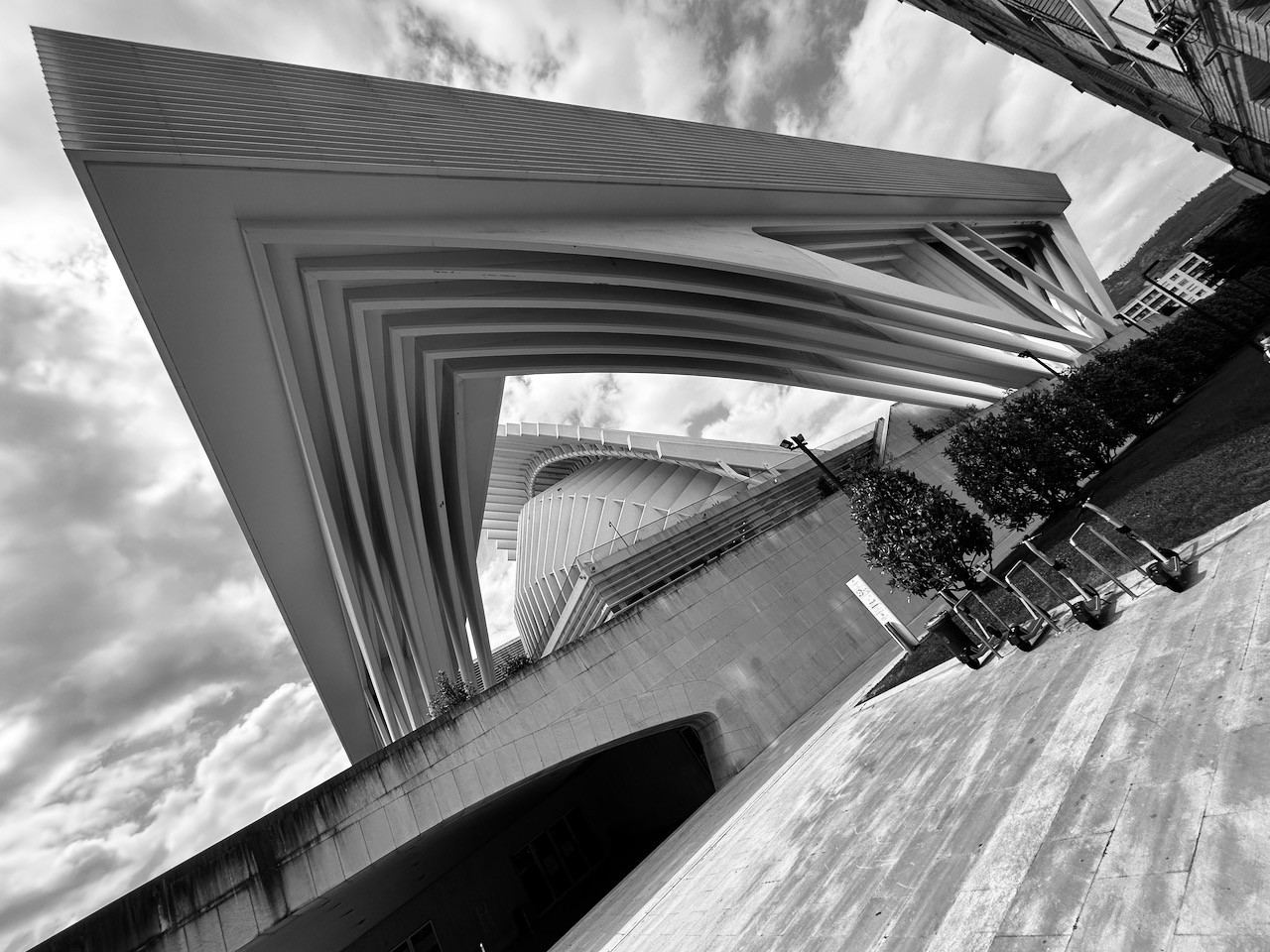 Fotografía en blanco y negro del exterior, fachada del Palacio de Exposiciones y Congresos de Oviedo, obra del arquitecto valenciano Santiago Calatrava.