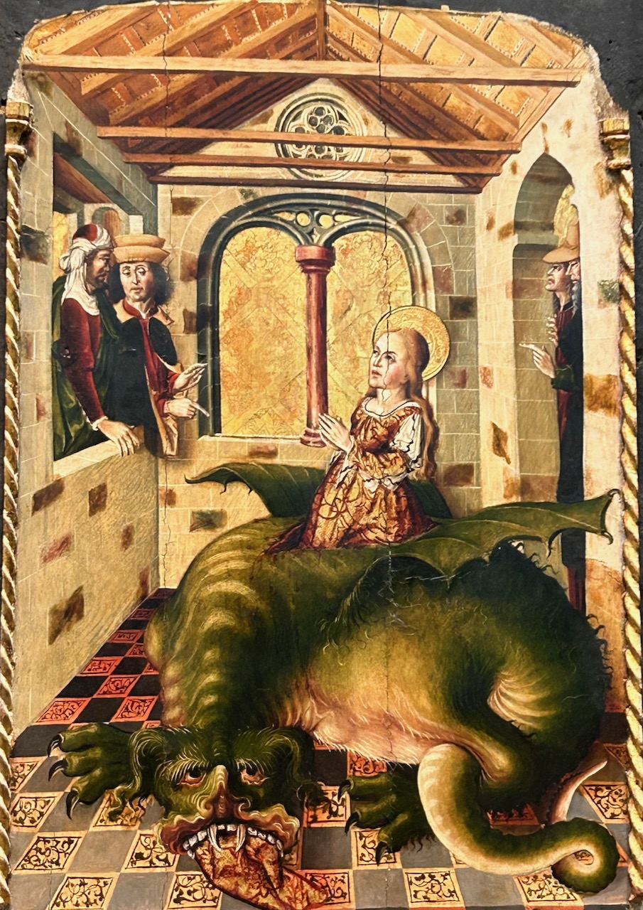 Detalle del retablo de Santa Marina expuesto en el Museo de Bellas Artes de Asturias en Oviedo. Imagen Santa Margarita contra el dragón.