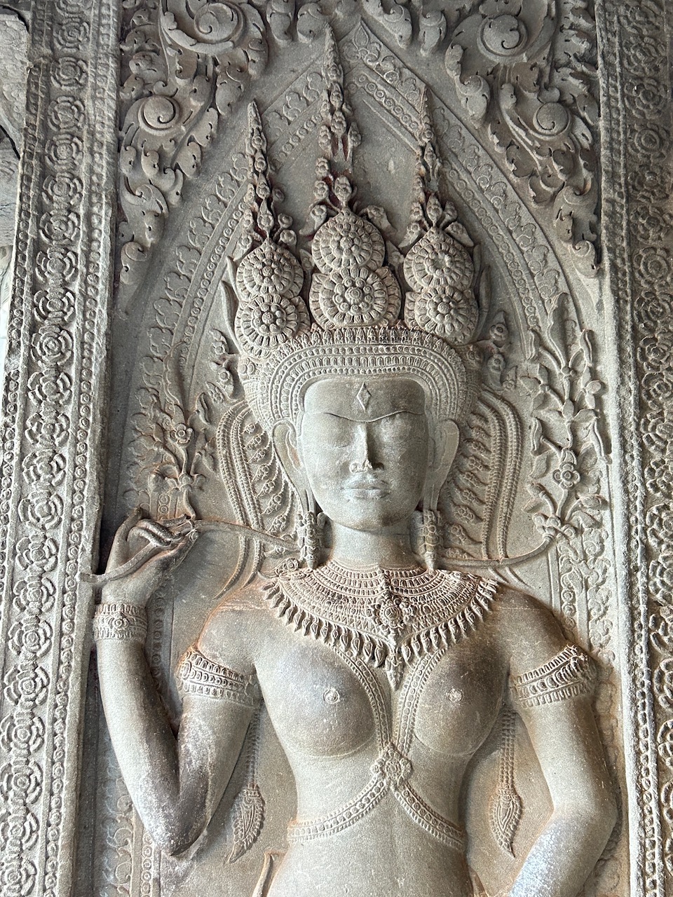 El templo de Angkor Wat es famoso por sus atractivas Apsaras (ninfas celestiales). Hay casi 2000 talladas en las paredes, cada una de ellas única, y lucen 37 tipos de peinados diferentes. En la imagen se puede apreciar el detallista ejemplo de la figura como elemento decorativo del mismo, en ese afán perfeccionista en el que la piedra parece un tejido.