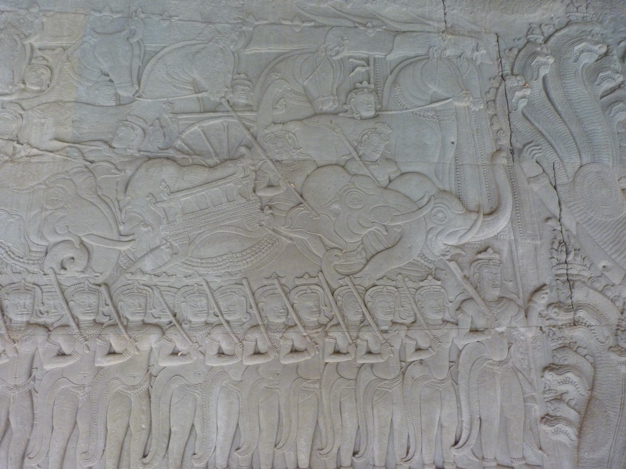 La remarcable sección occidental de la galería sur de Angkor Wat que ilustra la marcha triunfal tras la batalla del ejército de Suryavarman II, nos permite apreciar este pequeño fragmento del ejército que lo acompaña rodeado de la caballería y portentosos elefantes. En la esquina suroeste, a unos 2 m del suelo, está Suryavarman II montado en un elefante; llevara tiara real y va armado con un hacha de batalla, bajo la sombra de 15 parasoles y lo abanica una legión de sirvientes.