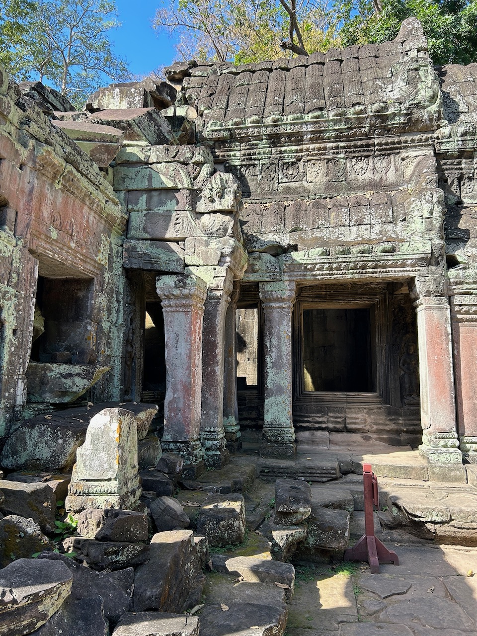 Si Angkor Wat es un testimonio del genio de los antiguos jemeres, Ta Prohm recuerda el increíble poder y fecundidad de la selva. Se trata de un templo budista dedicado a la madre de Jayavarman VII, empezado a construir en 1186 y originalmente se llamaba Rajavihara (Monasterio del Rey). Compuesto por torres, patios cerrados y estrechos corredores, muchos de ellos infranqueables al estar cubiertos por montañas de rocas desplazadas por las raíces de los árboles.