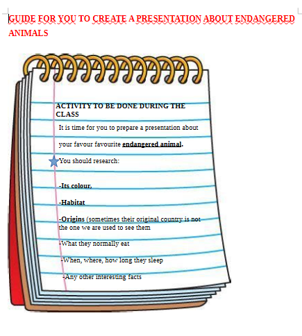 Esto es una guía para que estudiantes de 1 ESO hagan una presentación con powerpoint sobre animales en peligro de extinción.