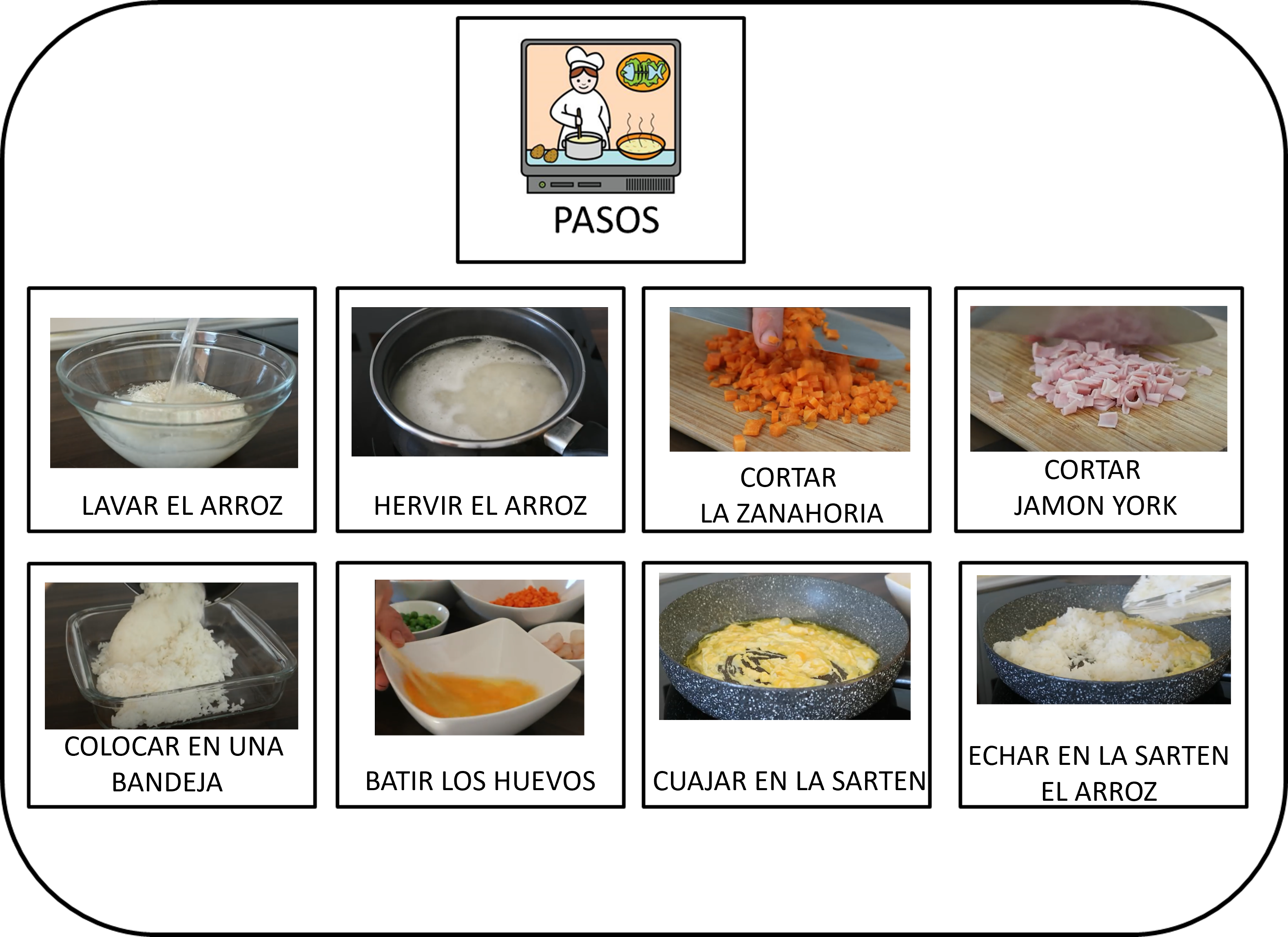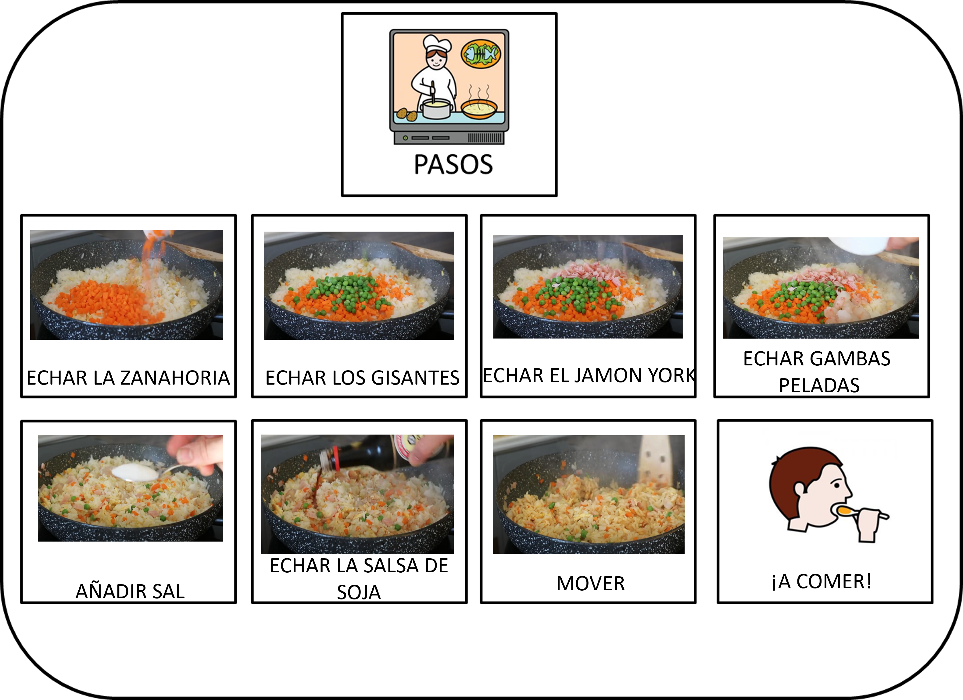 Partiendo de este modelo, cada alumno realizará su recetario en el ordenador. Para ello utilizarán Canva y, con la ayuda de la profesora, buscarán imágenes en google, copiarán, pegarán, ajustarán el tamaño y escribirán (o copiarán) el nombre de cada elemento.