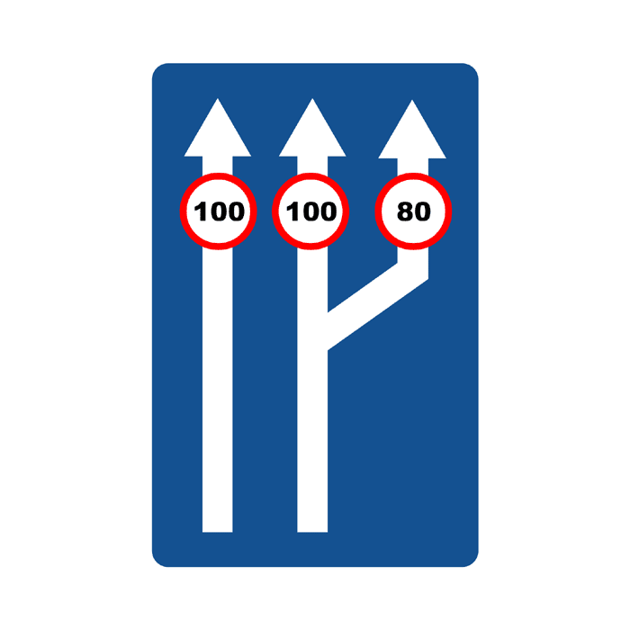 Paso de dos a tres carriles de circulación con especificación de la velocidad máxima en cada uno de ellos