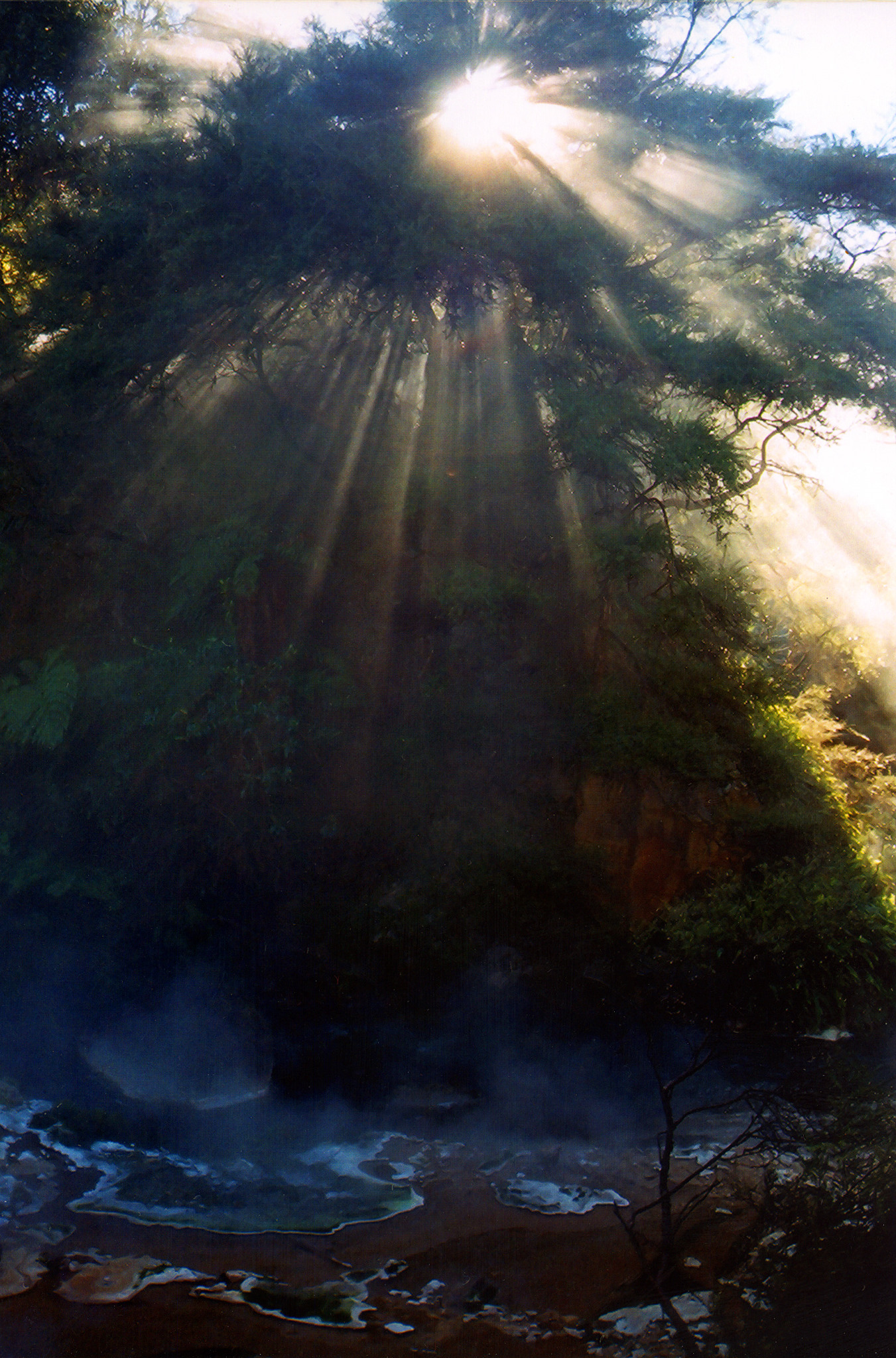 Erosión del suelo producida por río ácido y contraluz, Nueva Zelanda