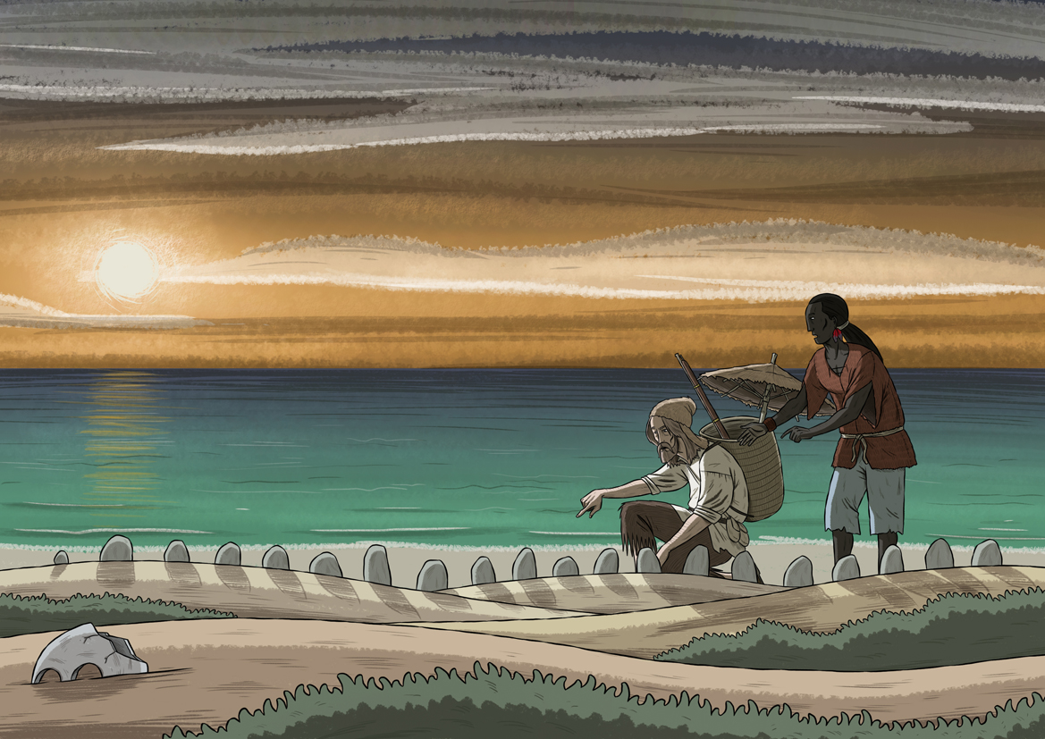 Robinson Crusoe: Viernes alinea piedras para que Robinson cuente a las personas sacrificadas en un ritual caníbal