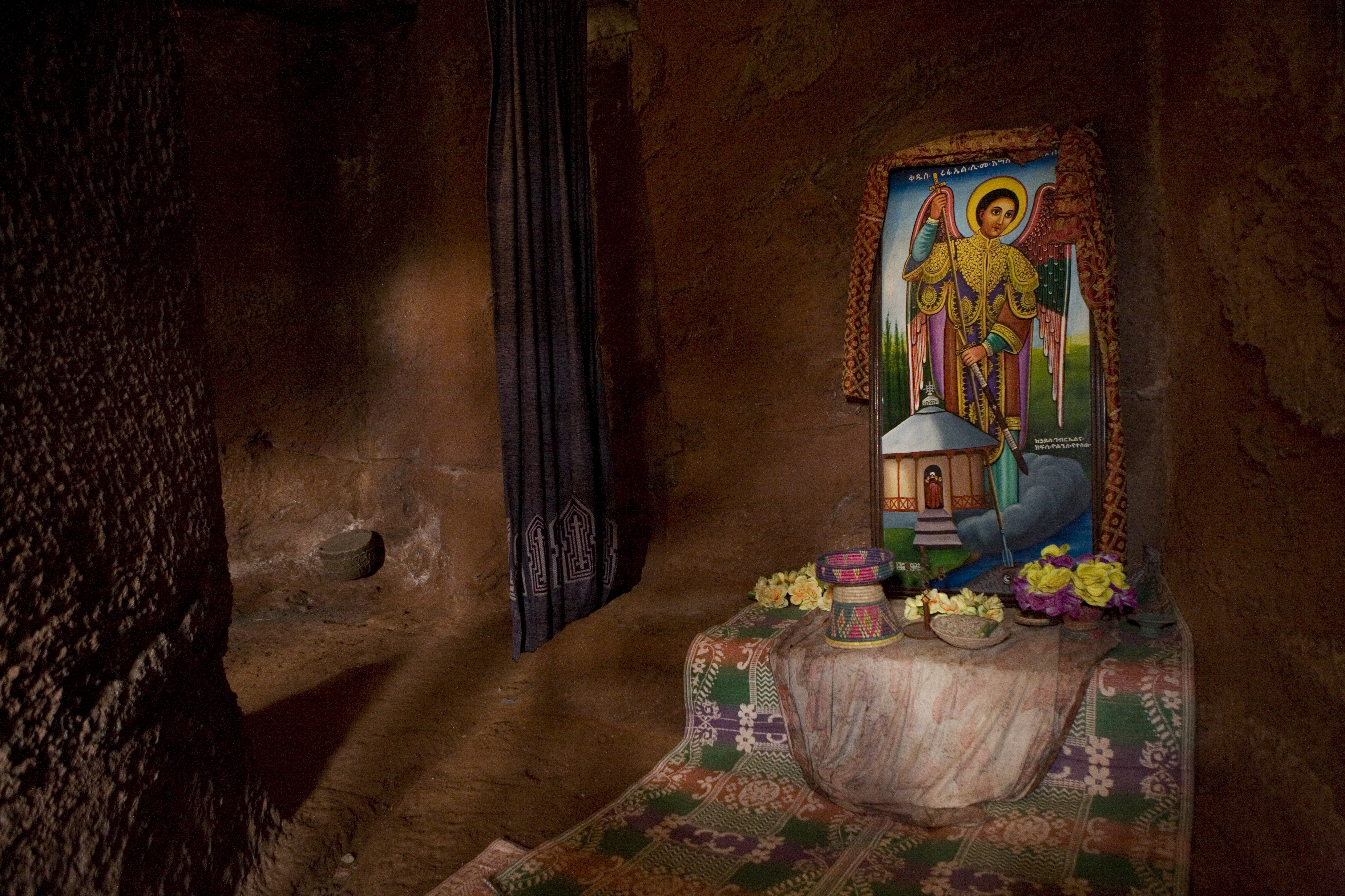Altar y representación del Arcángel Rafael en el interior Bete kidus Gabriel y Rafael, Lalibela, Etiopía