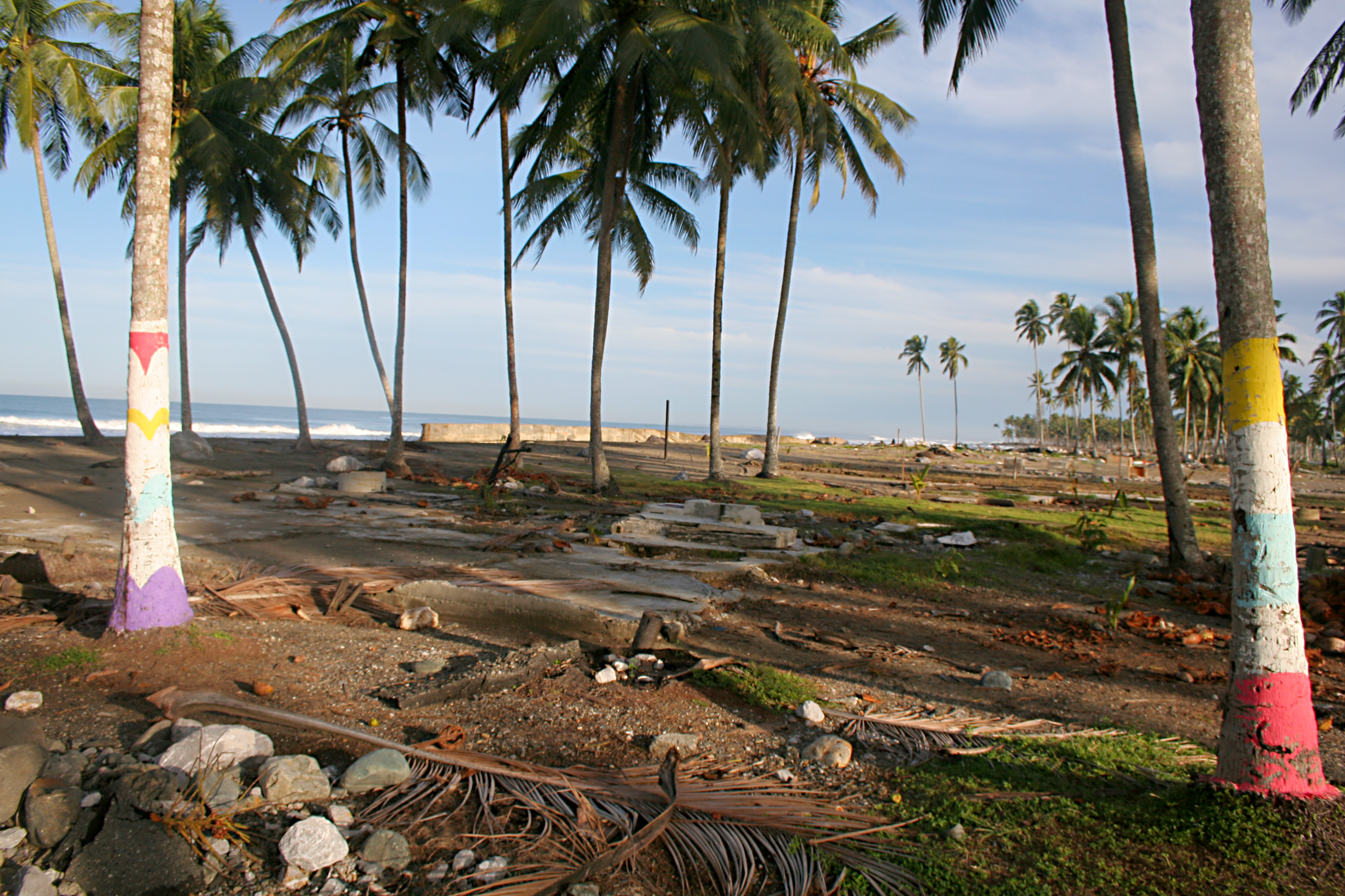 Zócalos de casas y palmeras pintadas de Melaboh, Sumatra, Indonesia