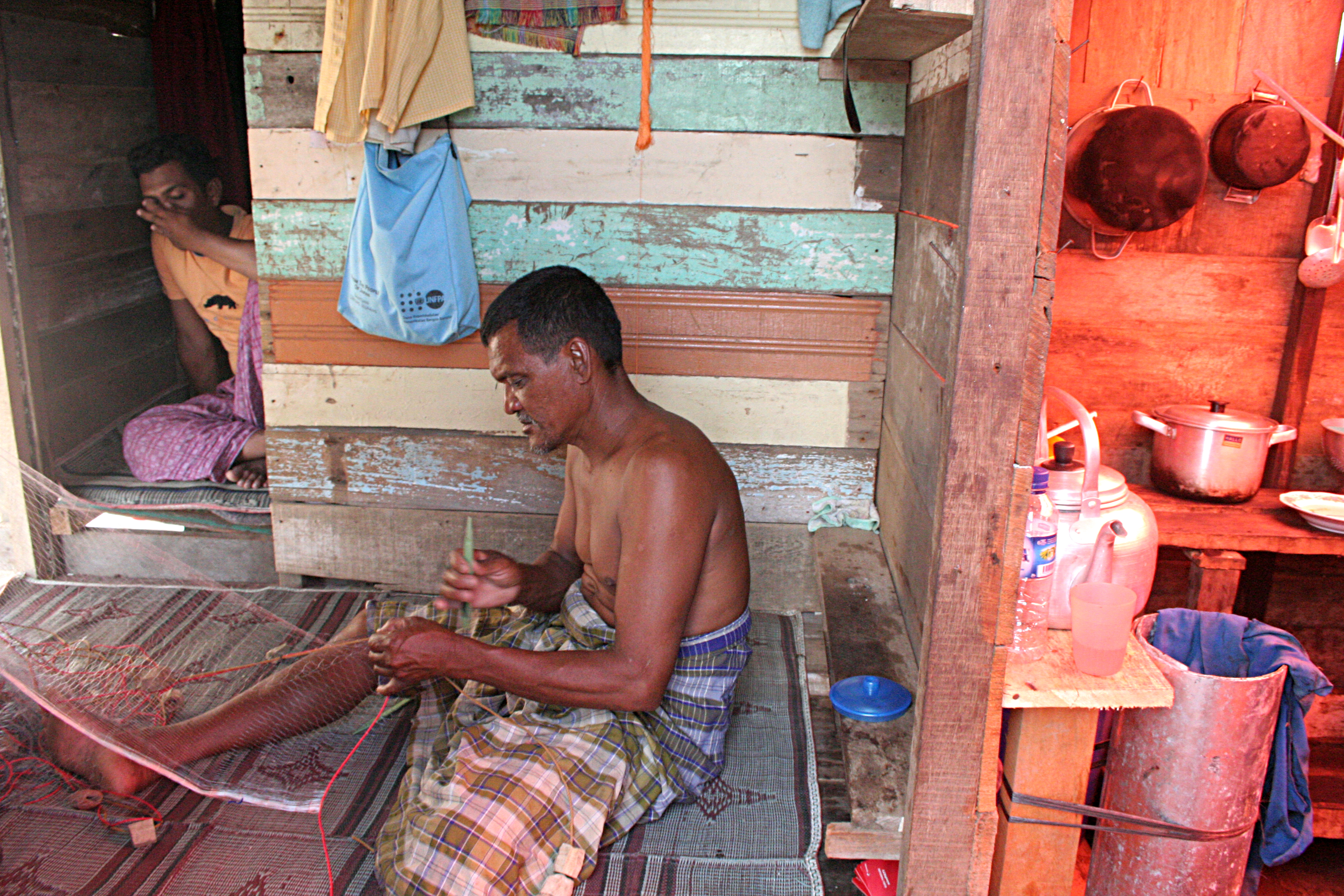 Arreglando redes del campamento de pescado de Alunaga, Sumatra, Indonesia
