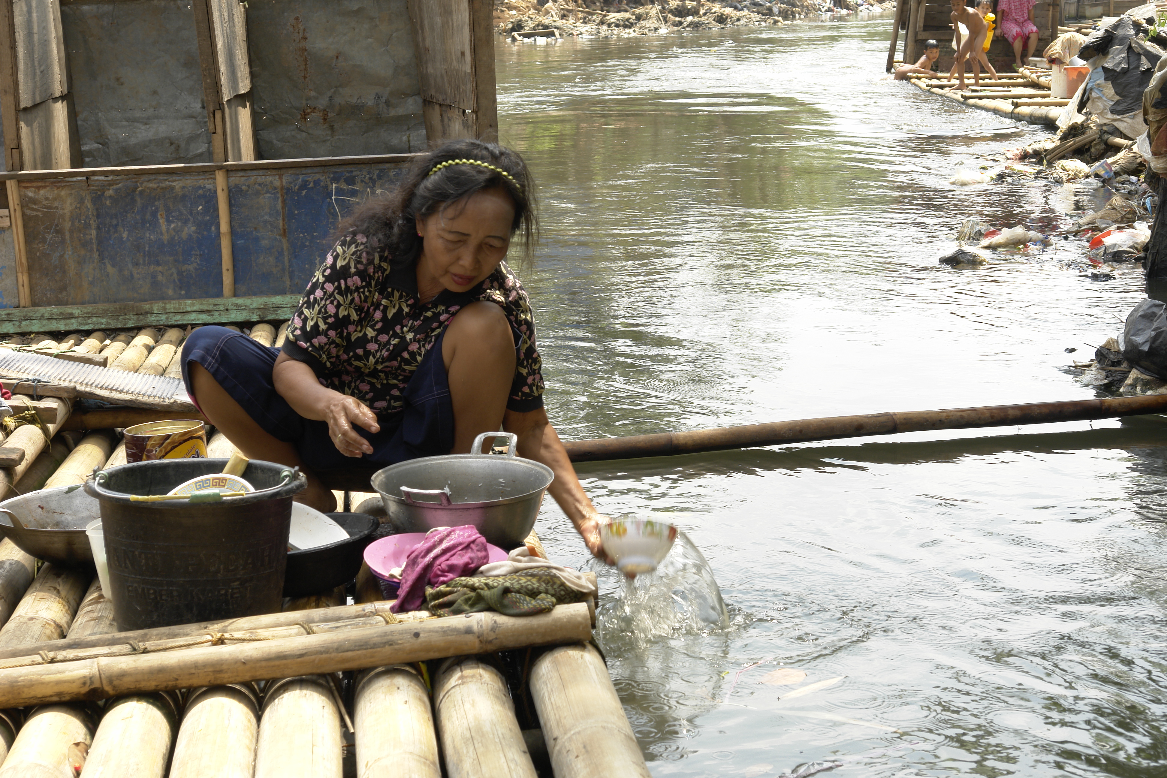 Lavando platos en el río Ciliwung, Yakarta, Indonesia
