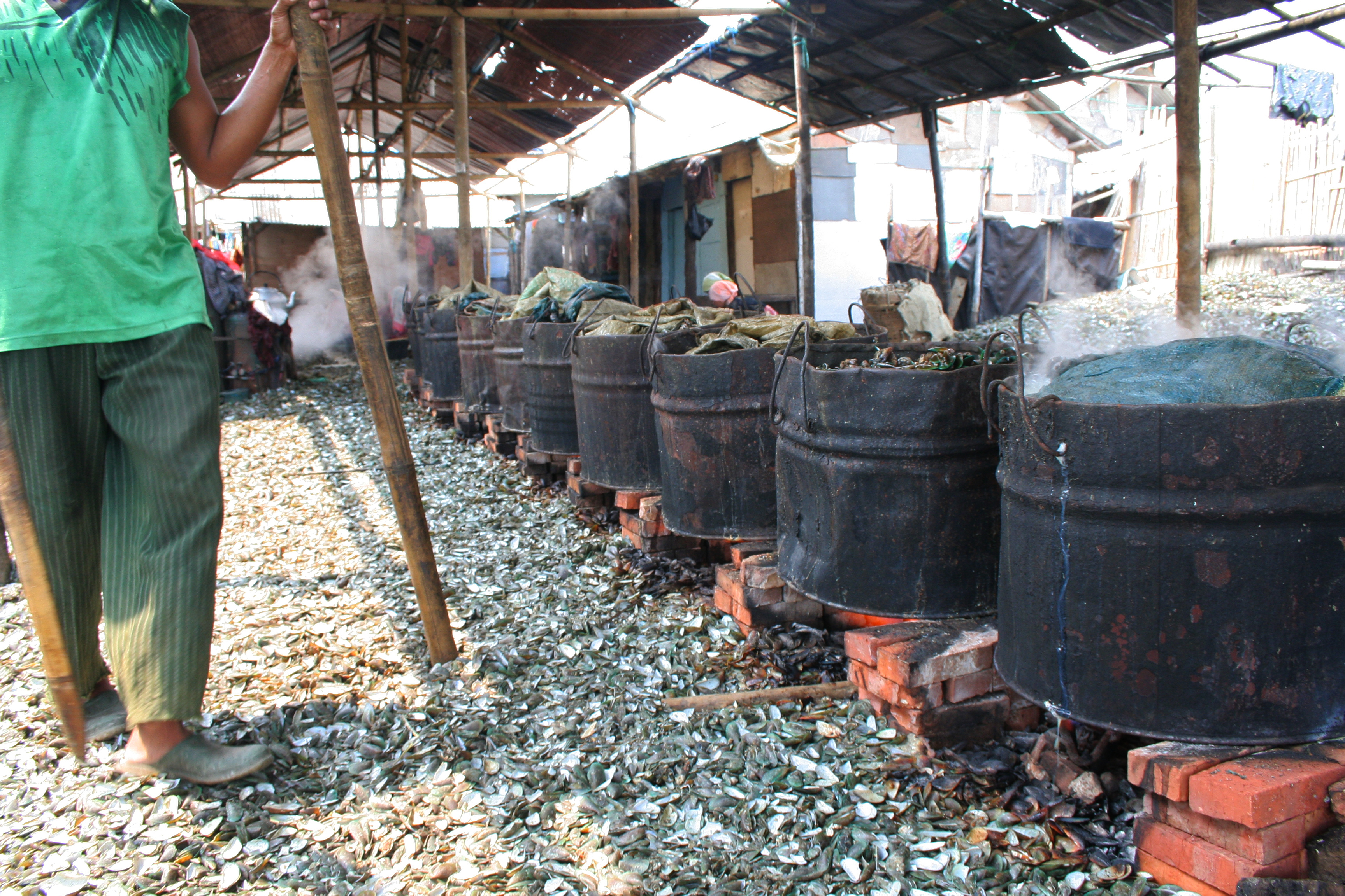 Cociendo mejillones en Jakarta, Indonesia