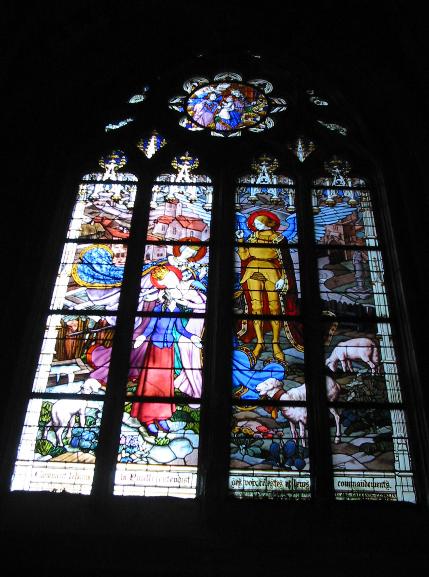 Vidriera sobre Juana de Arco, "la pucelle d'orleans".
